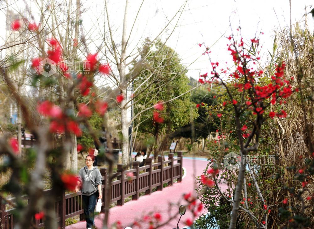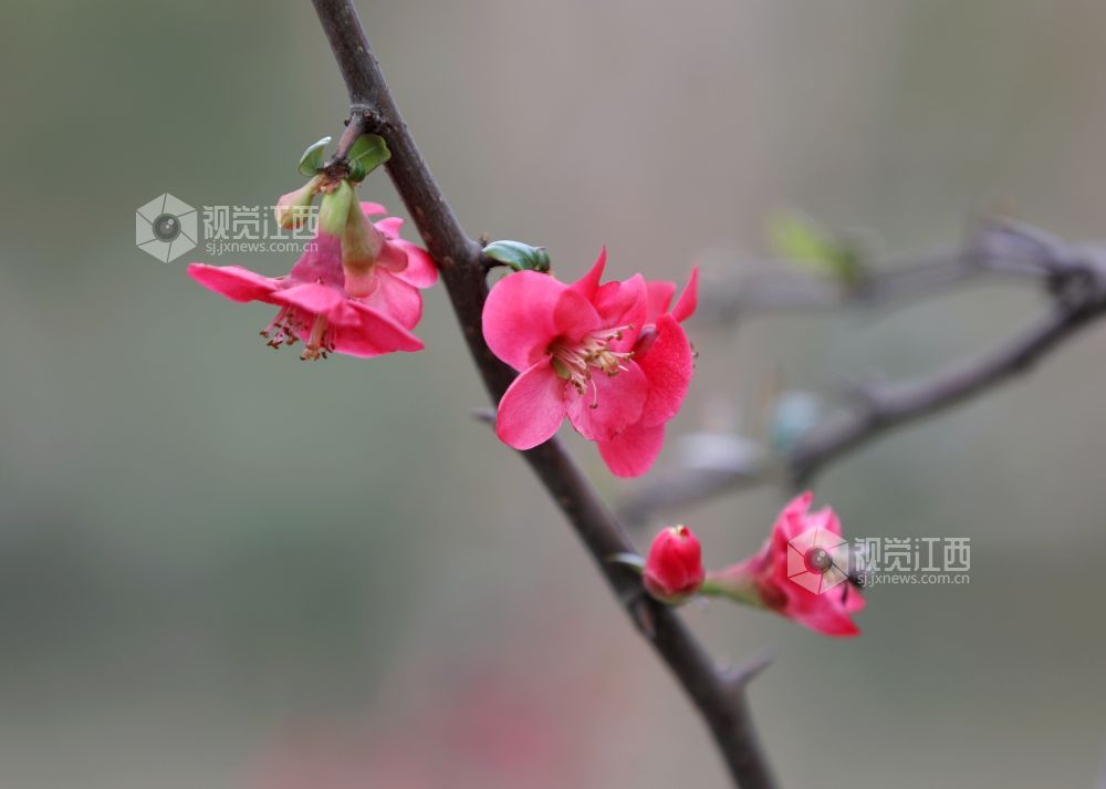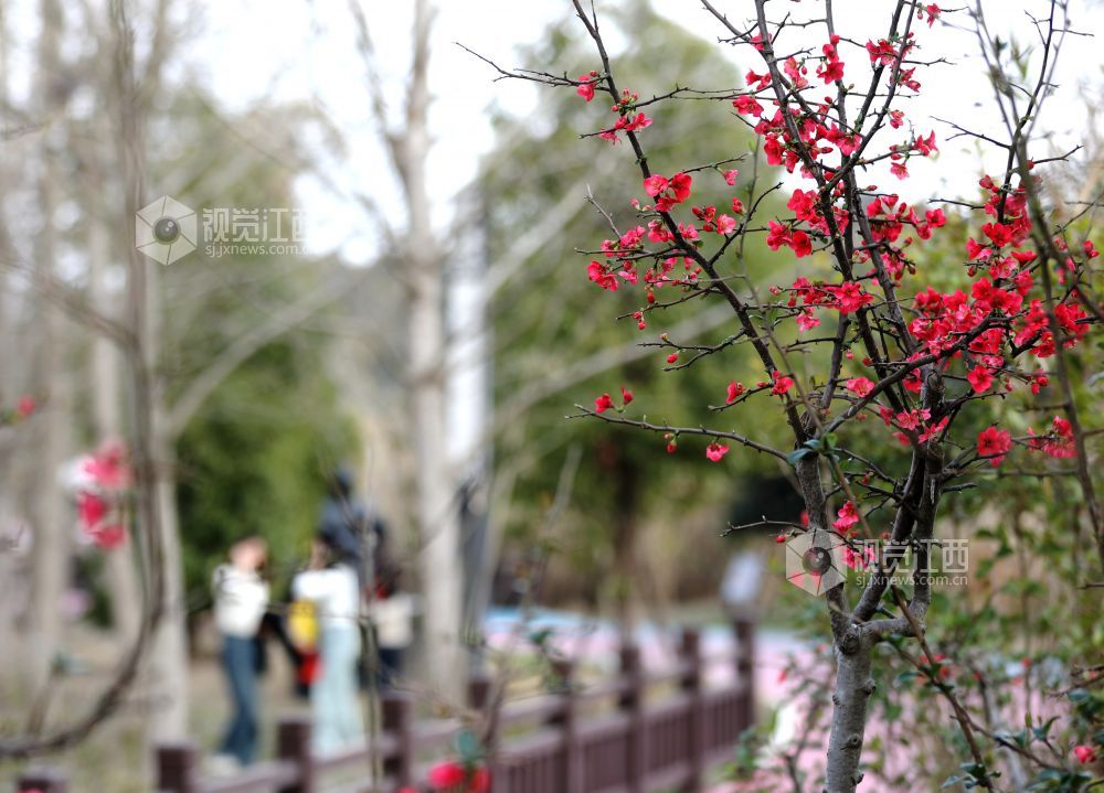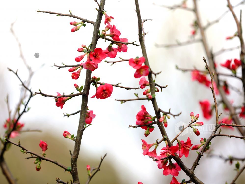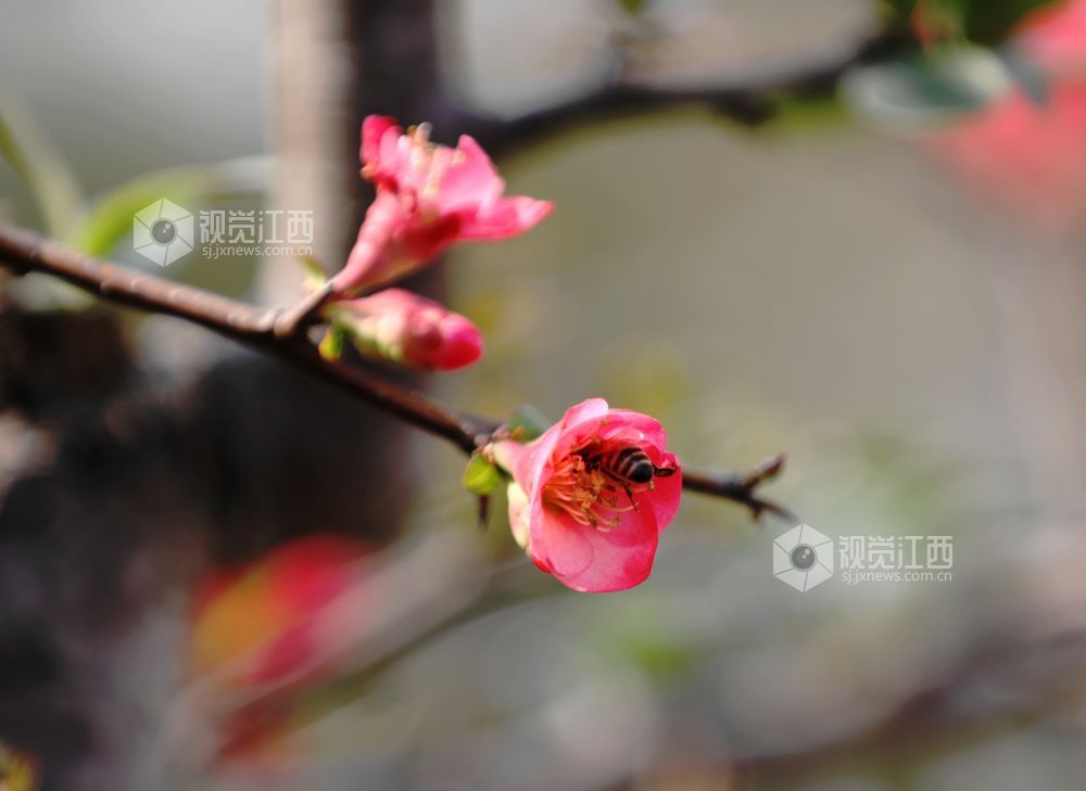朵朵奇葩贴梗红,新妆锦绮映凌空。2025年3月1日,江西省分宜县钤山湖水生态湿地公园数十株贴梗海棠迎春绽放,红色的花朵傲立枝头,鲜润丰腴,绚烂耀目。连日来,随着气温回升,湿地公园的贴梗海棠陆续绽放,花姿优雅。火红的花瓣,簇拥着淡黄的花蕊,在春日暖阳的照耀下,热情洋溢、分外夺目,勤劳的蜜蜂在花间嬉戏、采蜜,勾勒出一幅美丽的早春图景。据了解,贴梗海棠是蔷薇科植物,因为花朵大多紧紧地贴在枝干上,因此叫作“贴梗海棠”。