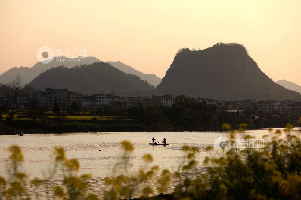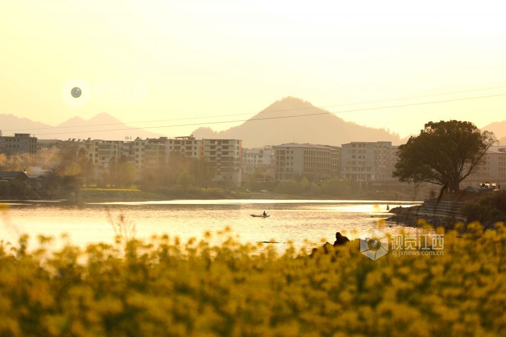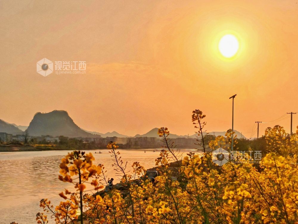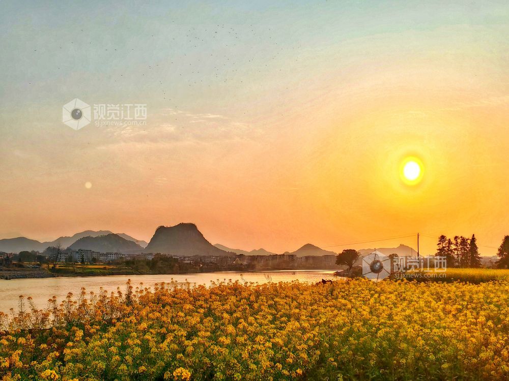 2025年3月19日,江西省分宜县分宜镇芦塘村境内的袁河流域,一轮夕阳挂在天边,余晖映照在河面和广阔的油菜花田地,画面显得灵动、柔和,温馨可人,美不胜收,令人神往。