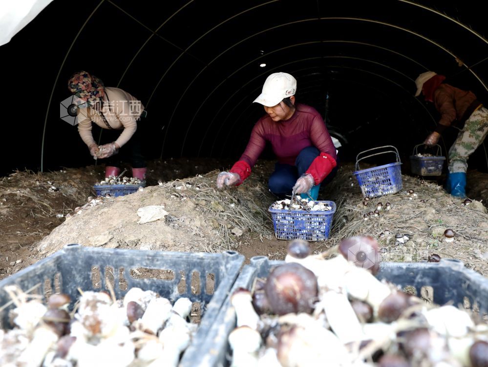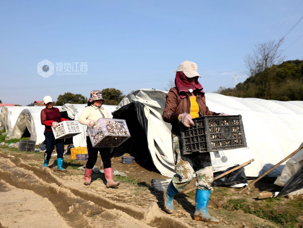 2025年3月18日,江西省分宜县分宜镇东兴村赤松茸种植基地,村民忙着采收成熟的赤松茸。赤松茸,又名大球盖菇,成品鲜菇色泽艳丽、食味清香、营养丰富,享有“素中之荤”“菌中之王”的美誉,以其种植技术简单、周期短、产量高、市场前景好、生态适应性强等特点,成为农户种植菌菇的首选品种。