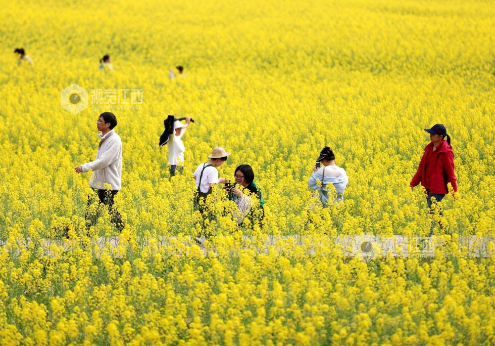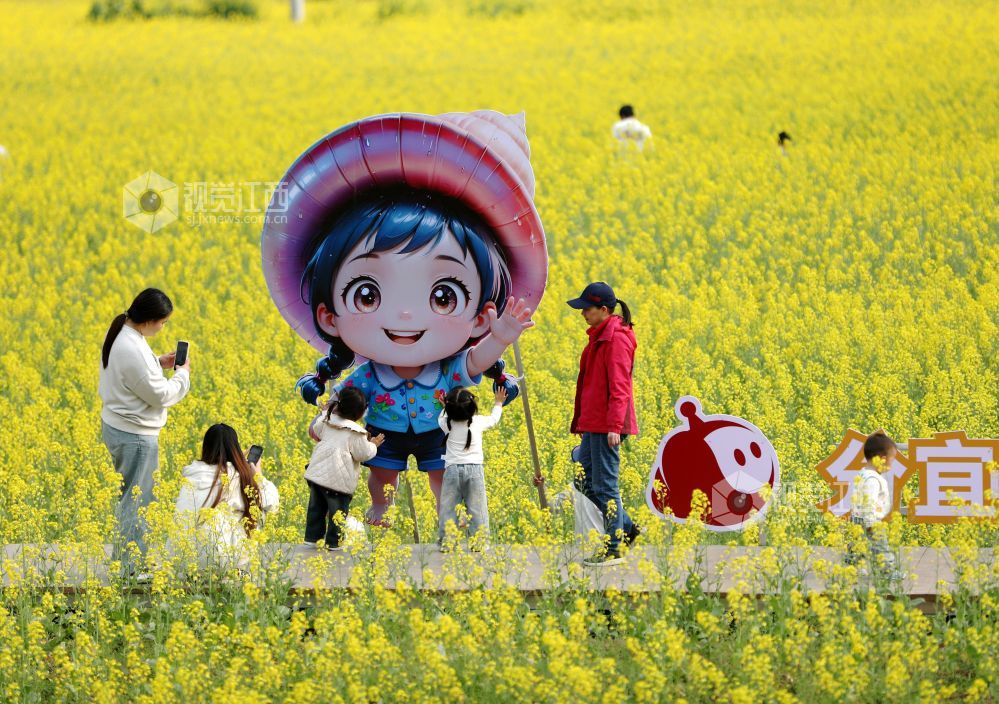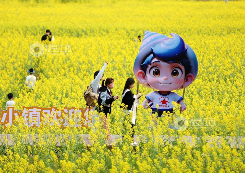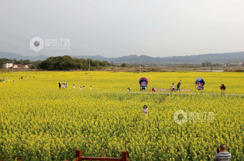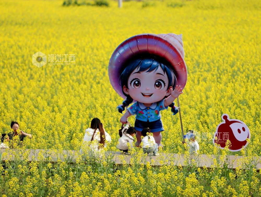 2025年3月23日,游客和市民在江西省分宜县电厂螺蛳小镇景区的油菜花海打卡游玩。