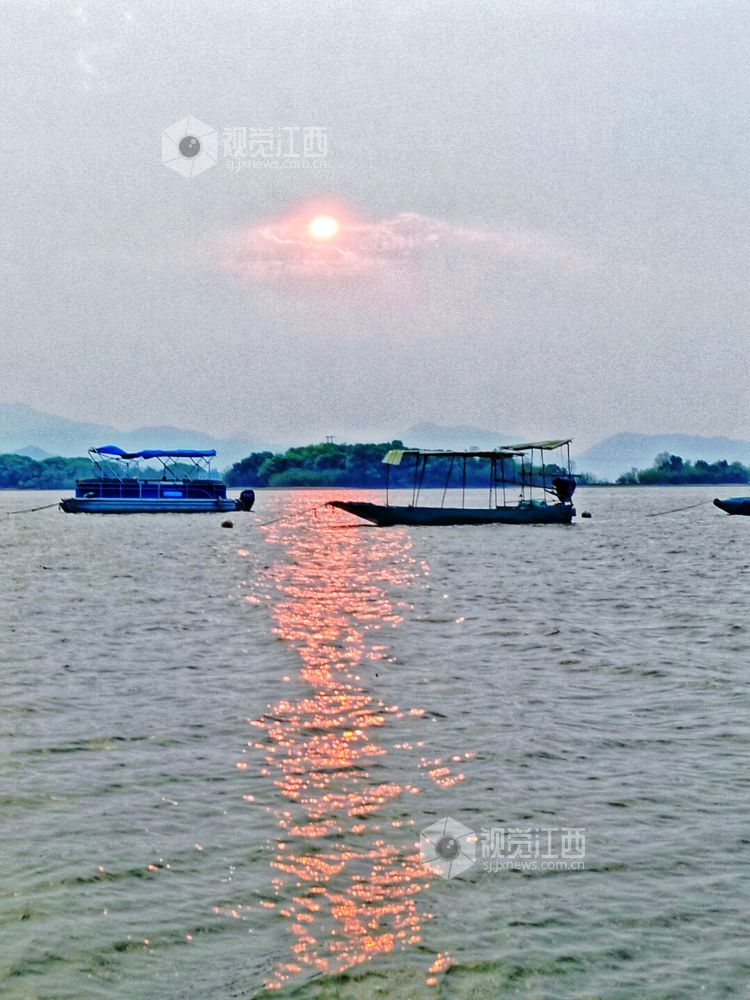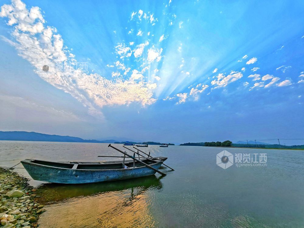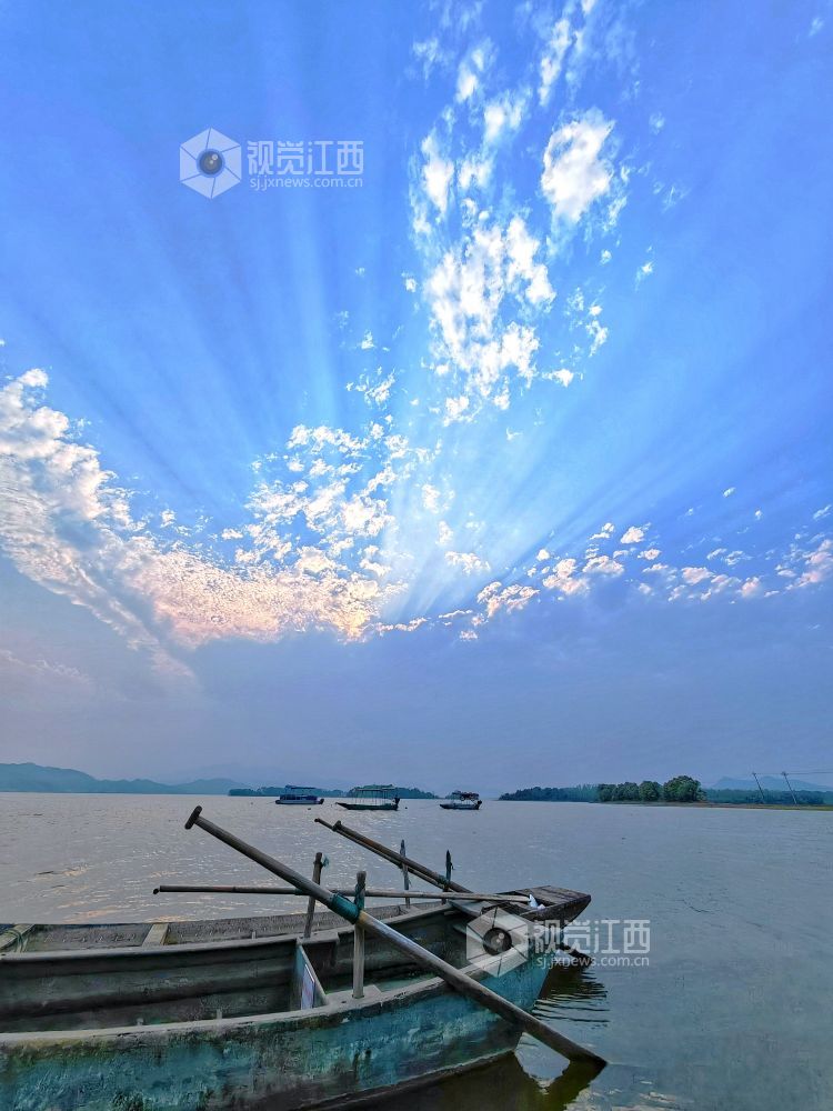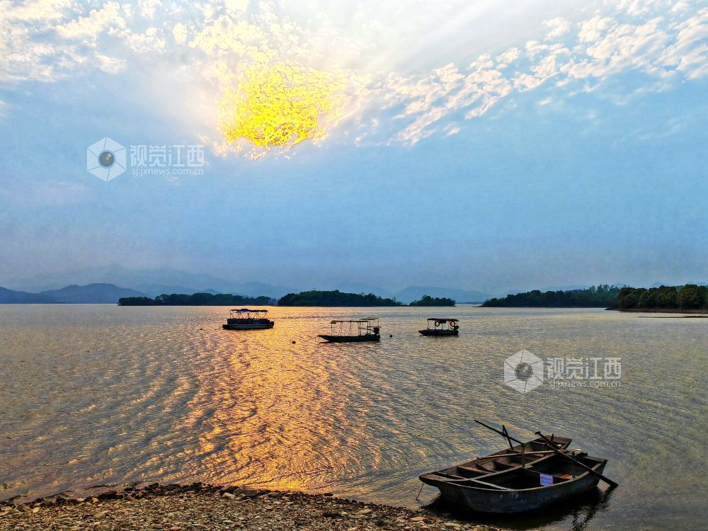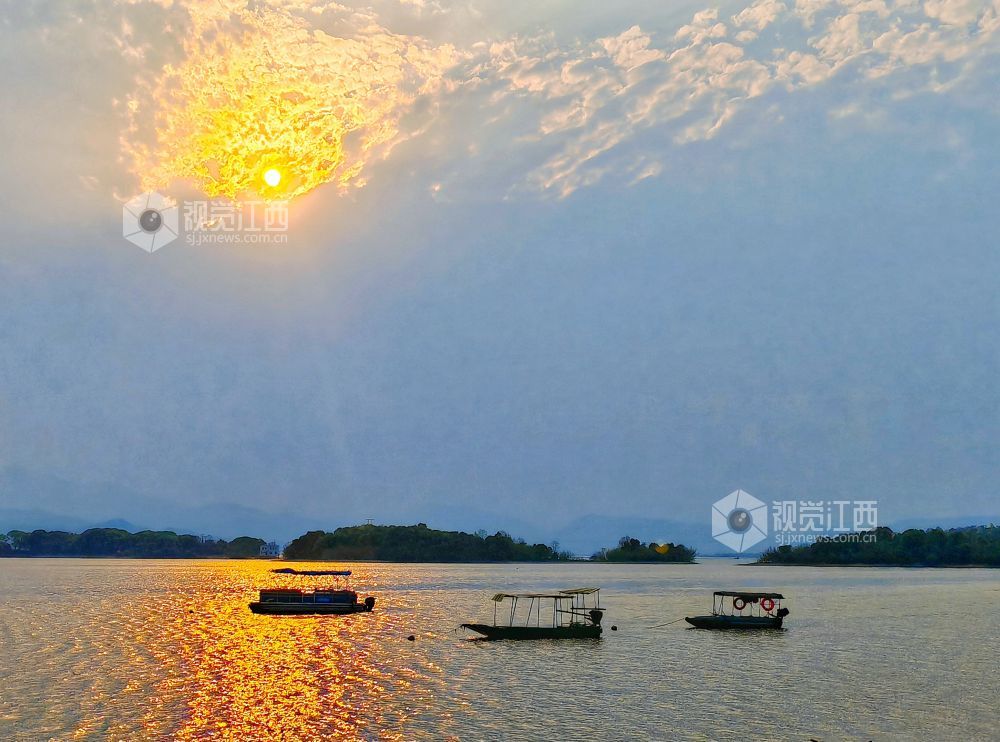 2025年3月27日,江西省分宜县钤阳湖,夕阳被托举在云层,光泽绚烂却不炽热,湖水、小船、远山,都笼罩着神秘而迷人的霞光,宛如一幅美丽的油画,让人陶醉其中。