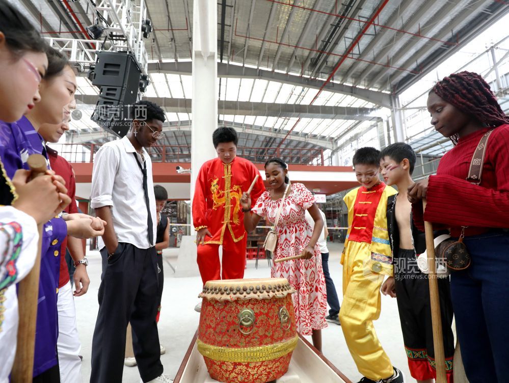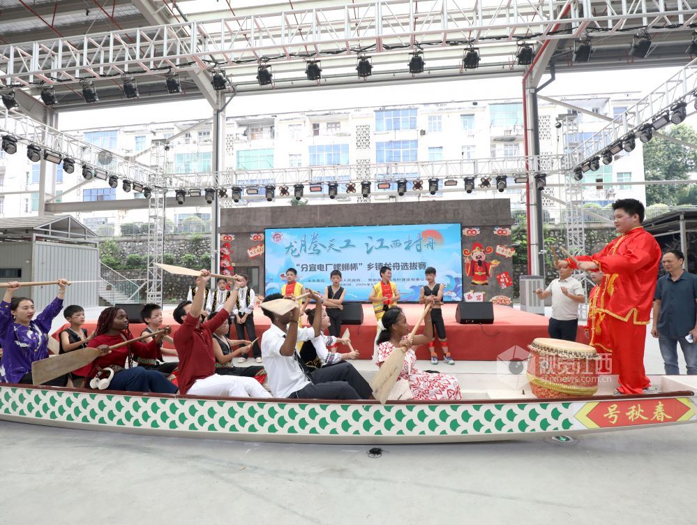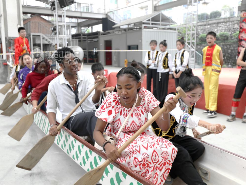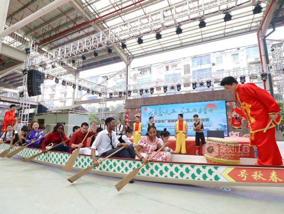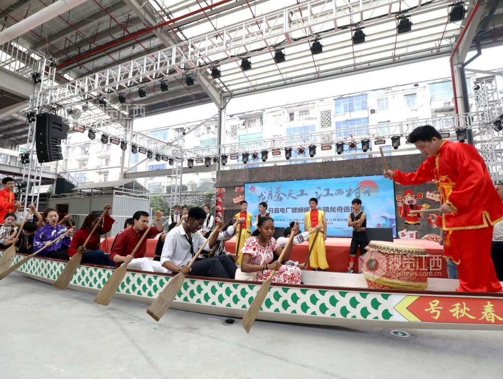 2025年5月25日,江西省分宜县在电厂螺蛳小镇举行“龙腾天工 江西村舟”龙舟赛,迎接端午节的到来。在龙舟赛开幕式上,来自江西工程学院的外国留学生观看了龙舟舞和龙舟号子表演,学习敲鼓点划龙舟,体验中华优秀传统文化,感受浓厚的端午节氛围。