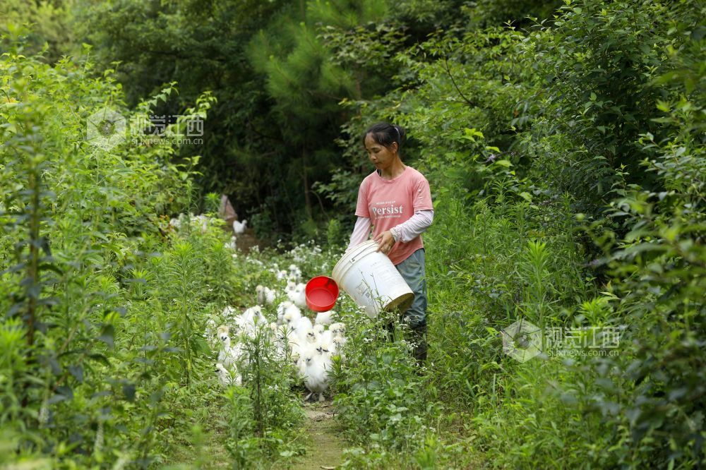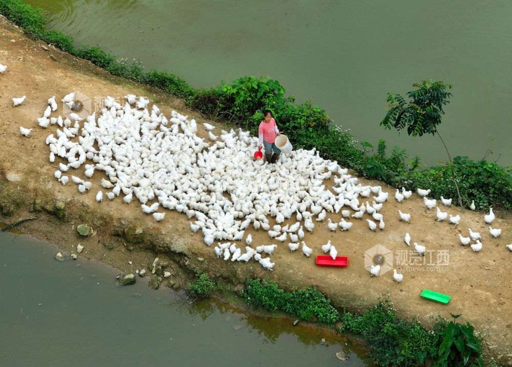 6月11日,江西省吉安市泰和县中龙乡中龙村林下乌鸡养殖基地,农民正在给乌鸡喂食。