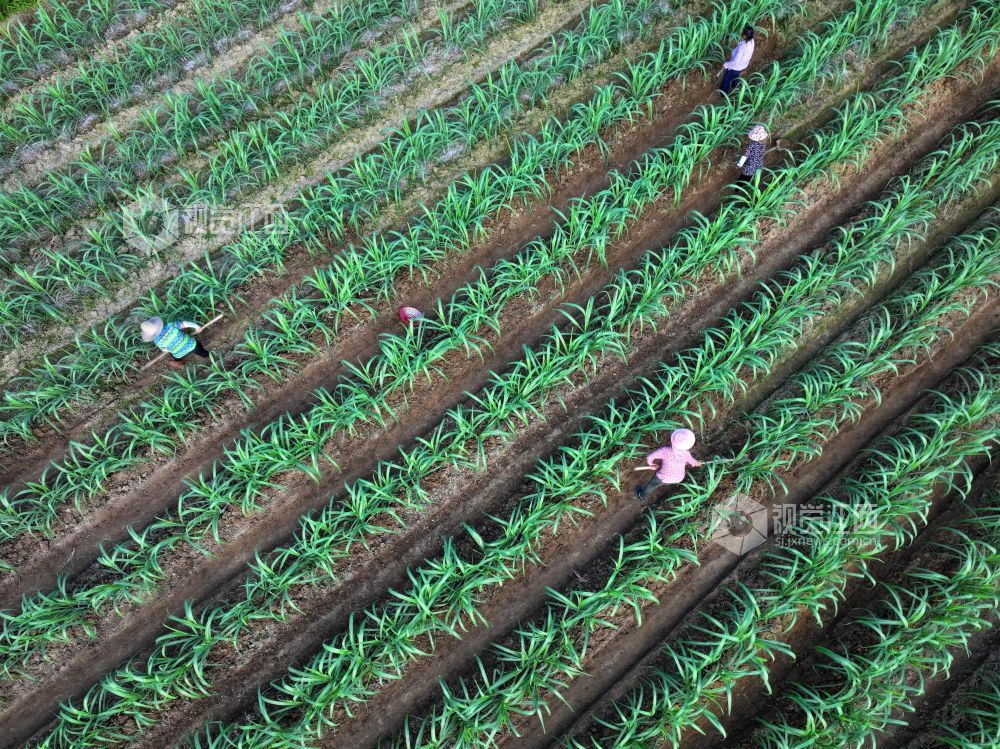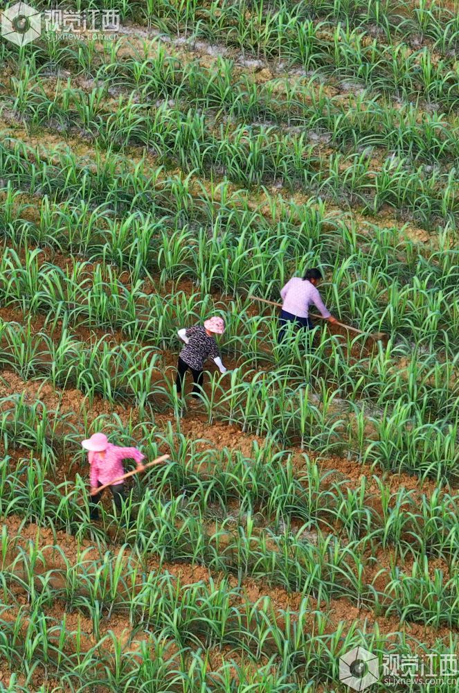 6月13日,江西省吉安市泰和县沿溪镇山东村,农民正在给甘蔗起垄培土管护劳作。