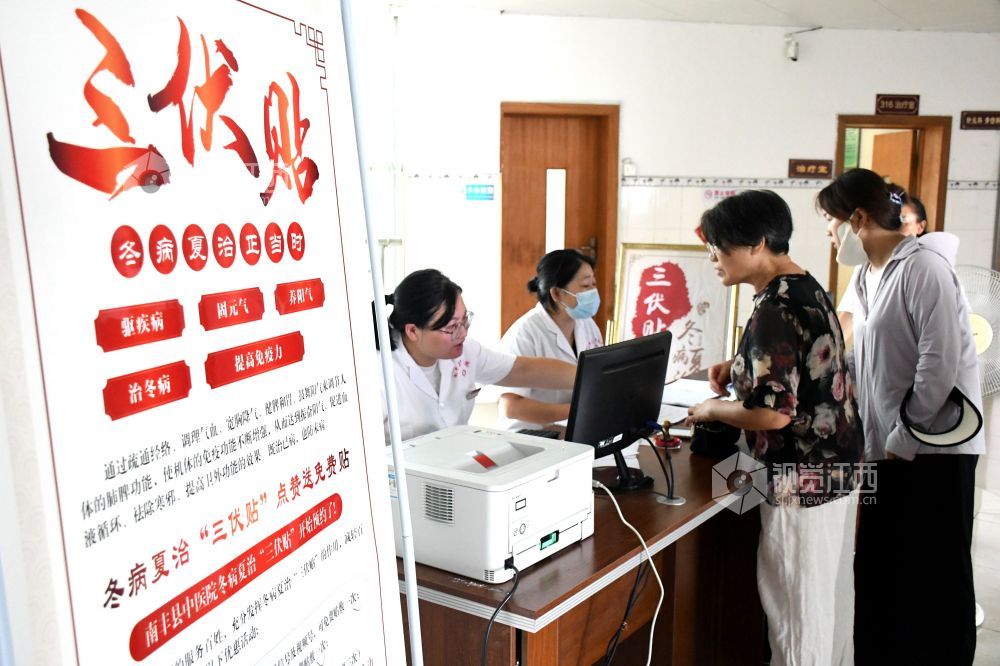 2025年7月20日,江西省抚州市南丰县总医院中医院分院,医务人员正在为患者登记就诊并贴“三伏贴”。