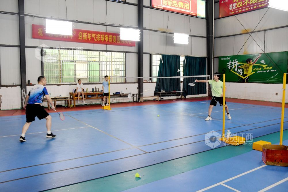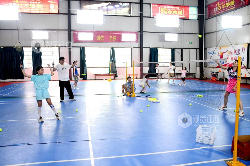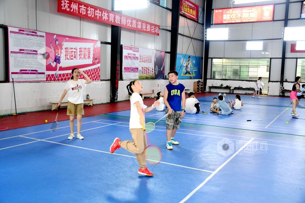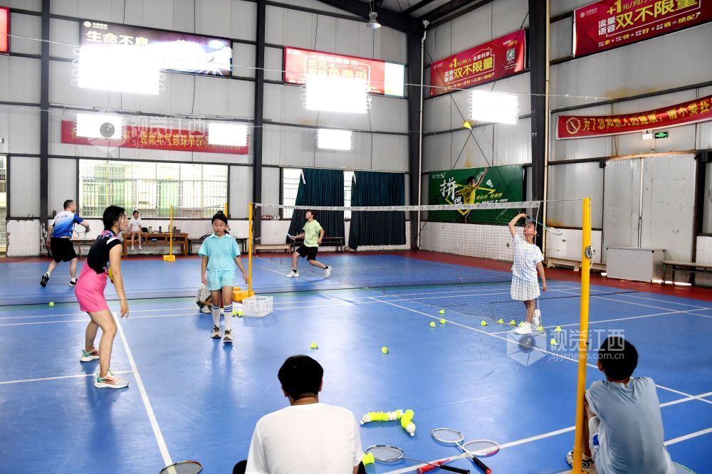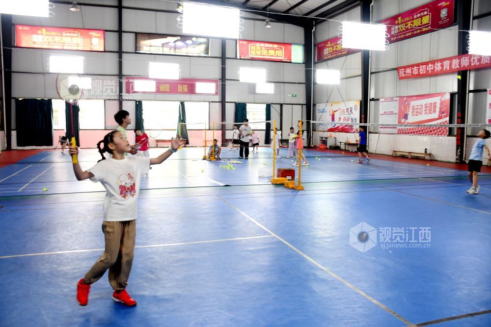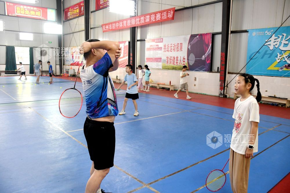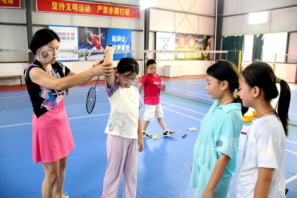 2025年8月13日,在江西省抚州市南丰县一羽毛球馆内,孩子们在教练指导下,练习打羽毛球。