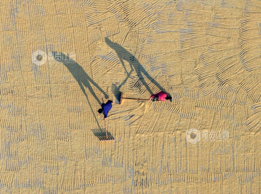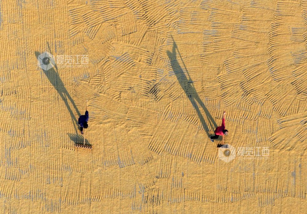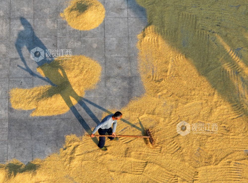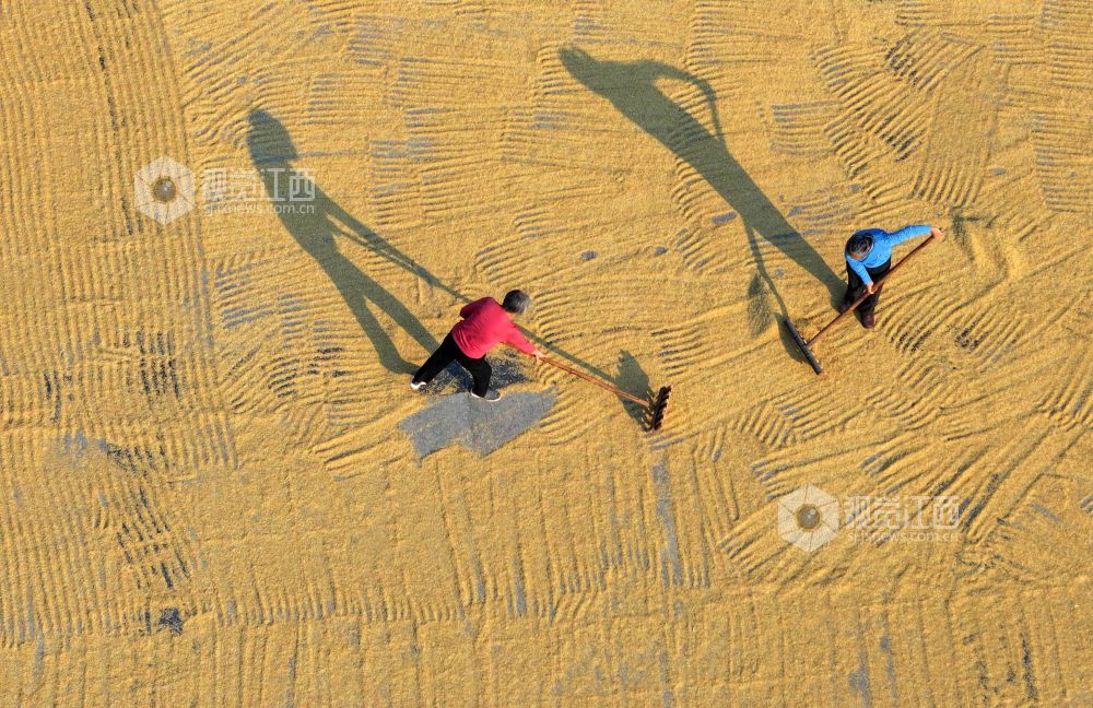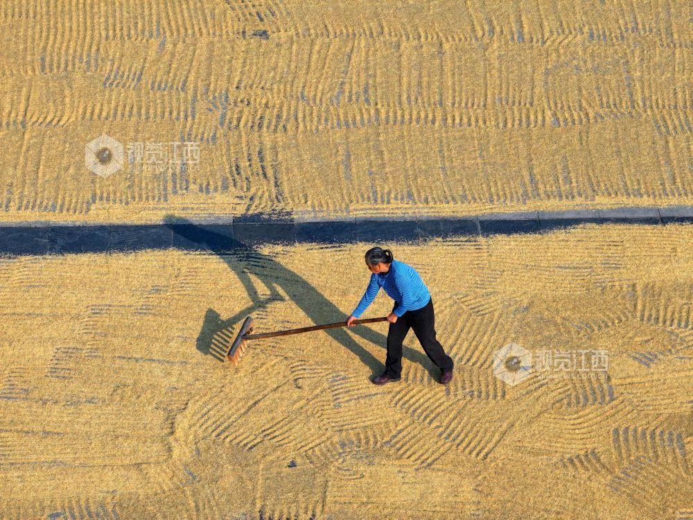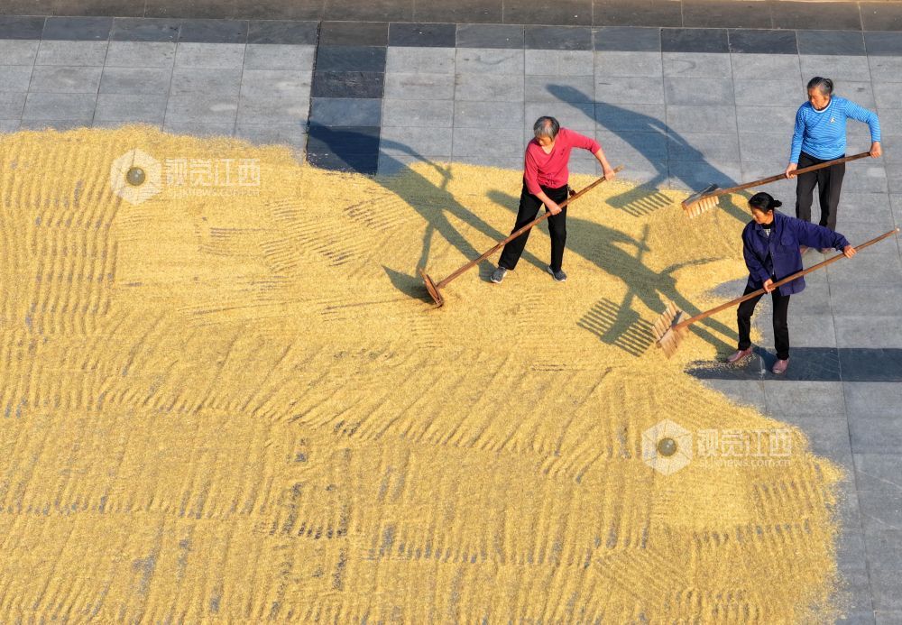 10月29日,江西省吉安市泰和县澄江镇官溪村,农民正在晾晒稻谷,确保颗粒归仓。