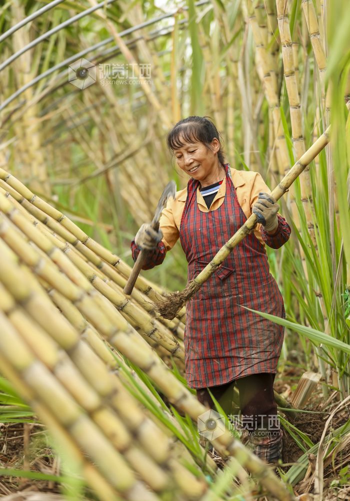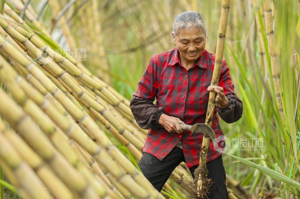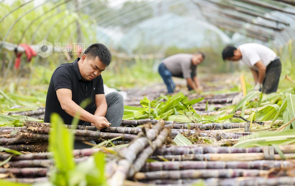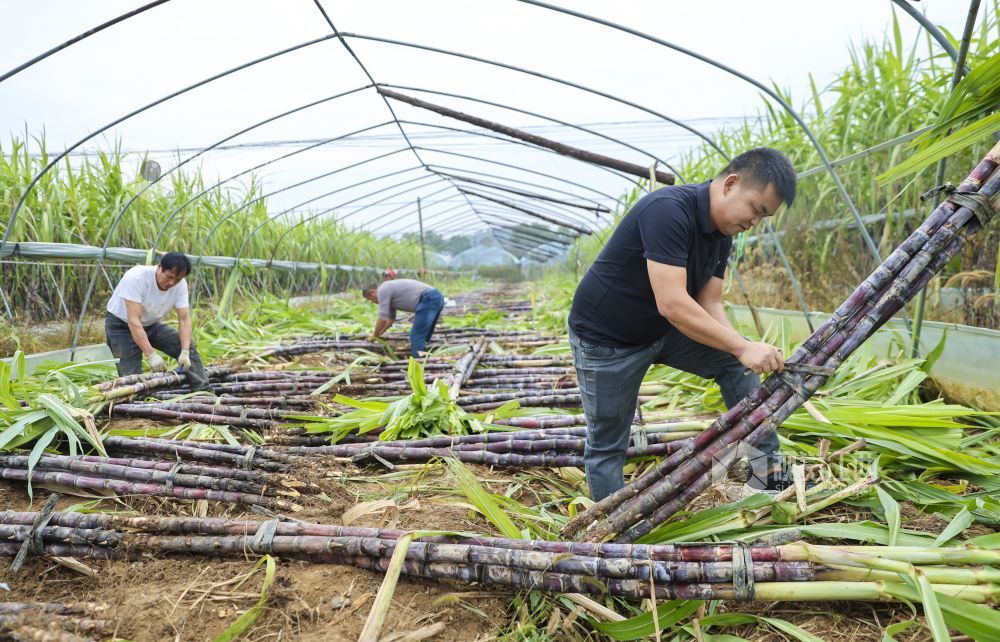2025年10月31日,江西省瑞昌市范镇源源村蓬博种养家庭农场,村民正忙着采收、打捆、装车甘蔗,供应市场。