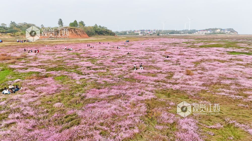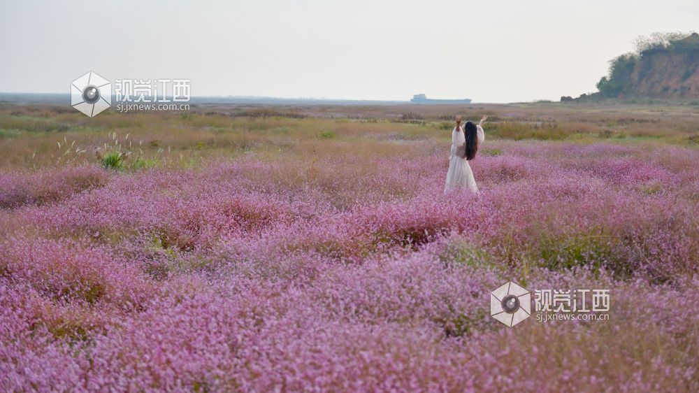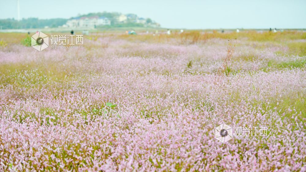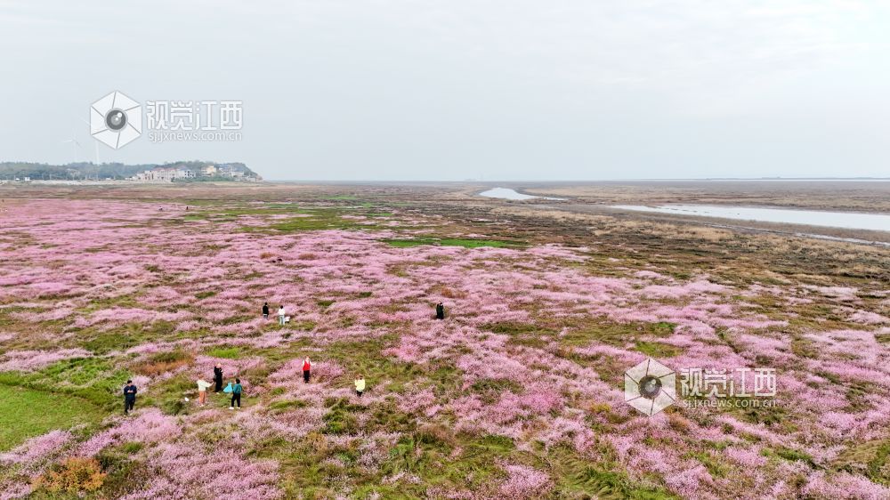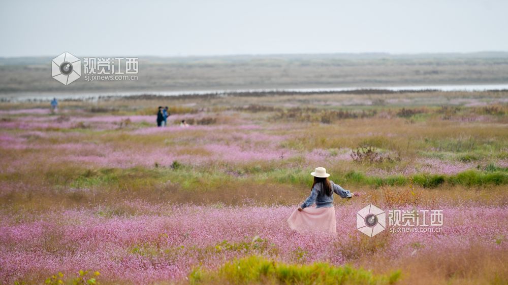 11月4日,鄱阳湖水位持续回落,江西省庐山市蓼南乡区域,成片蓼子花竞相绽放,将裸露湖洲铺成粉紫花海?;êS牒荨⑶沉飨嘤吵扇?,吸引省内外游客慕名打卡。这一奇观源于鄱阳湖枯水期湖底裸露,加之今年适宜的生长条件,蓼子花格外繁茂。