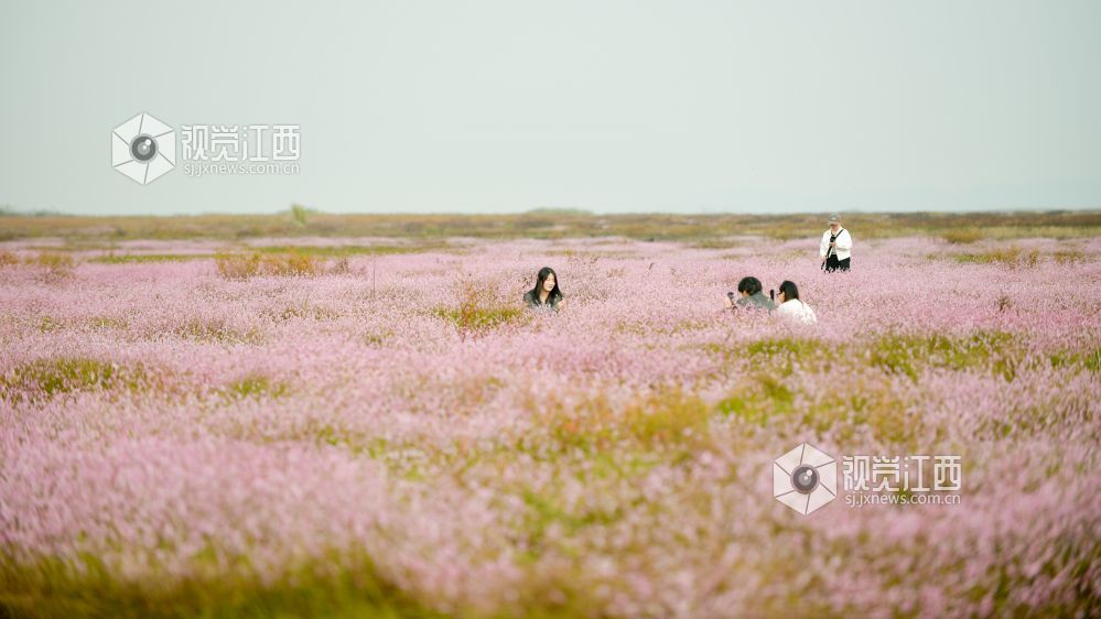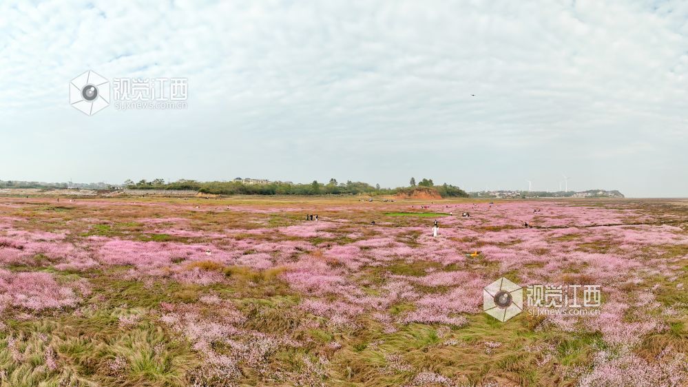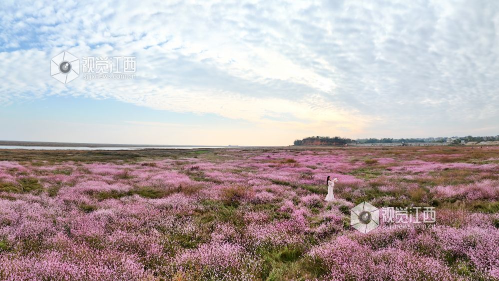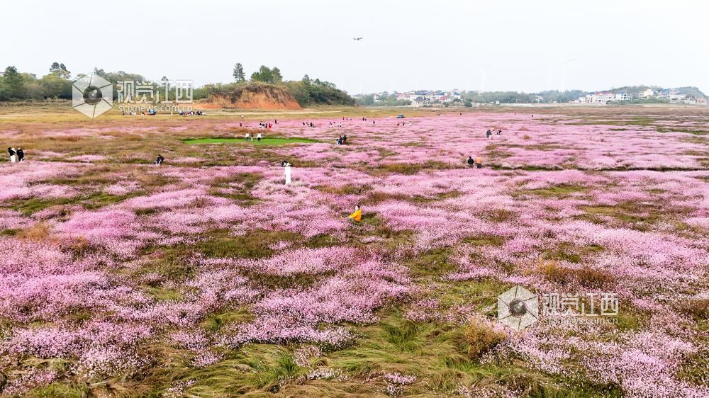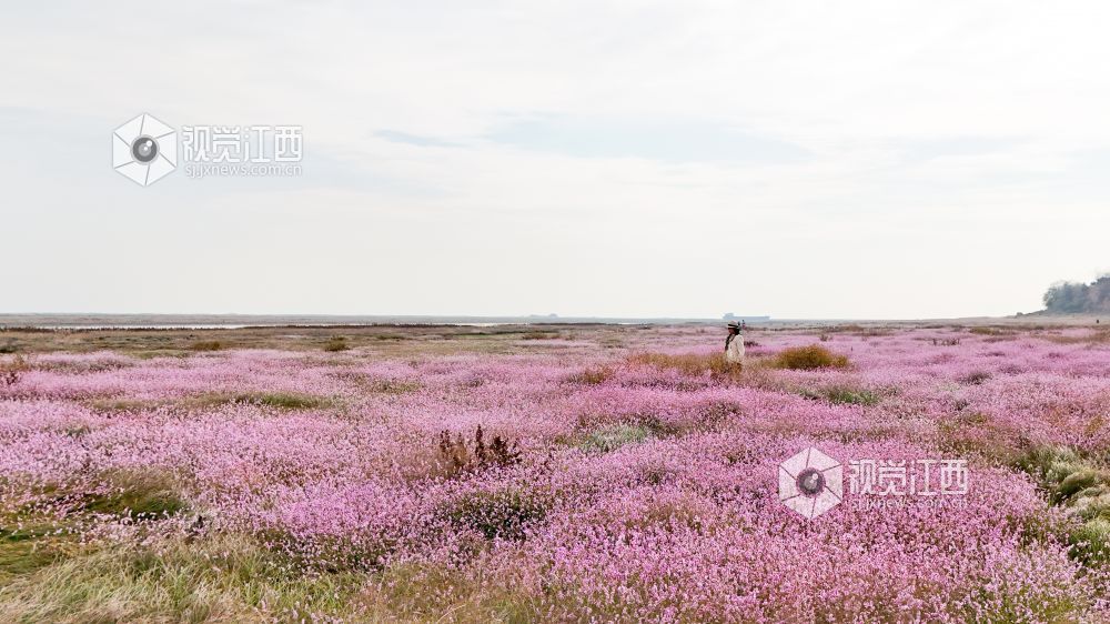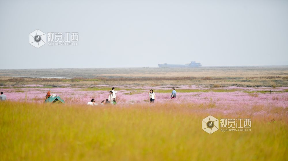 11月4日,鄱阳湖水位持续回落,江西省庐山市蓼南乡区域,成片蓼子花竞相绽放,将裸露湖洲铺成粉紫花海?;êS牒荨⑶沉飨嘤吵扇?,吸引省内外游客慕名打卡。这一奇观源于鄱阳湖枯水期湖底裸露,加之今年适宜的生长条件,蓼子花格外繁茂。