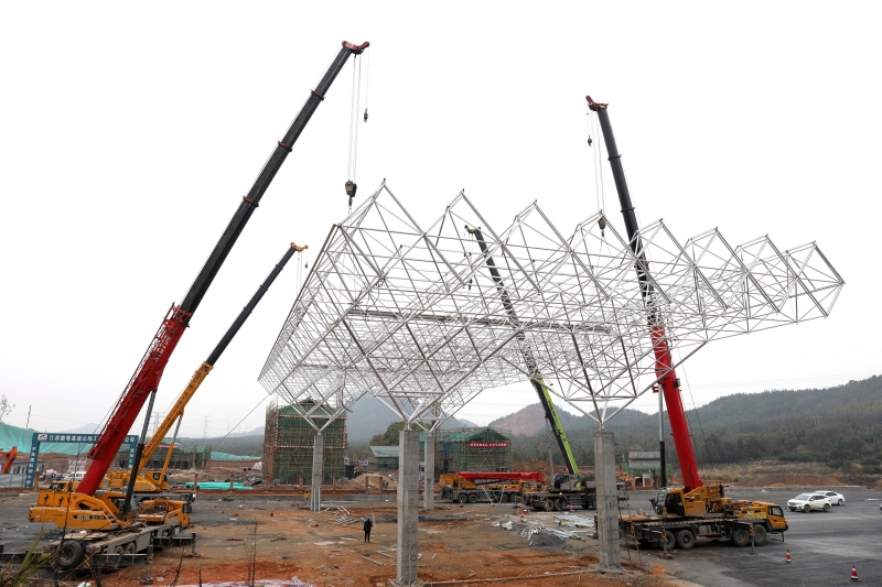 江西分宜:沪昆高速分宜互通整体移位工程新收费站防护棚架吊装完成