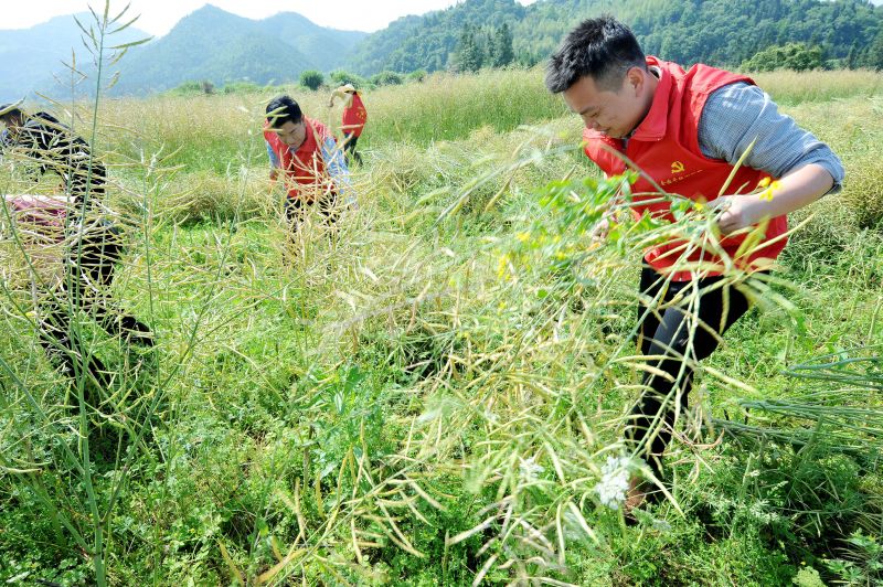江西德兴:党员义工田间地头助农收割油菜