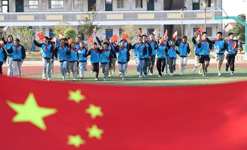 江西余干:与国旗合影 为祖国祝福