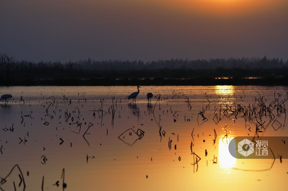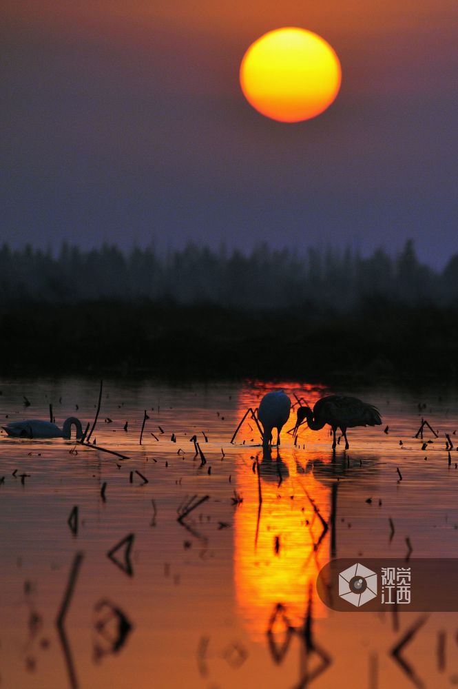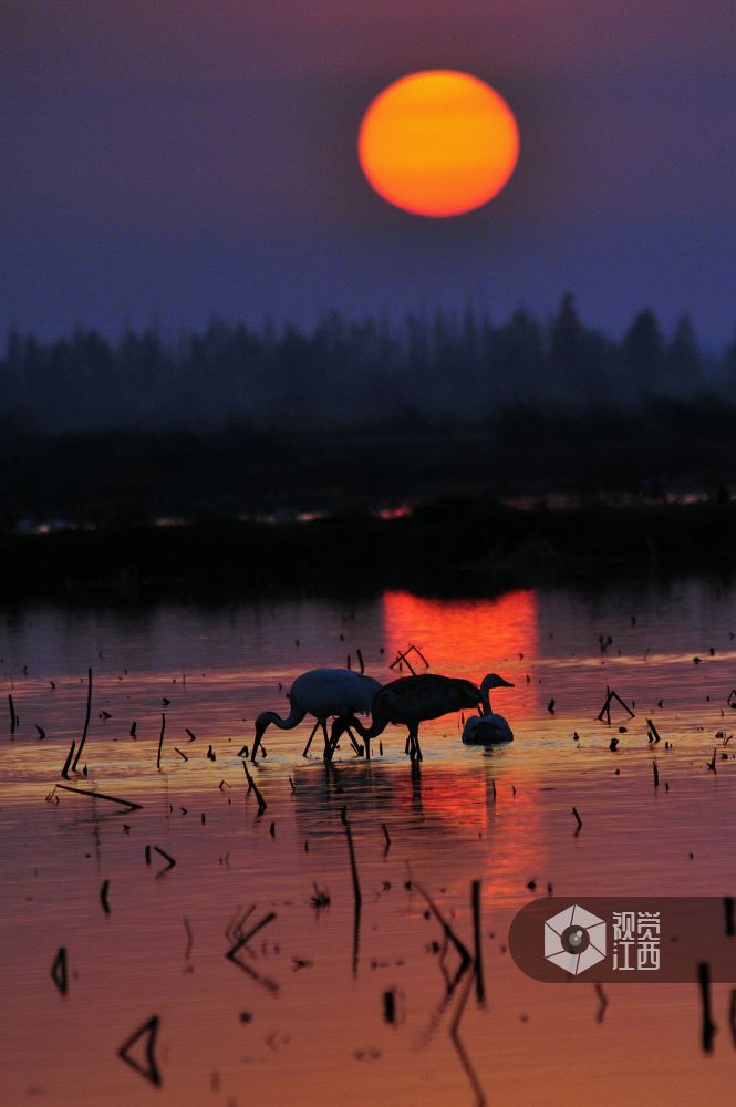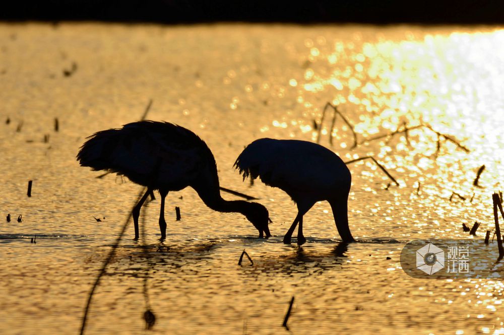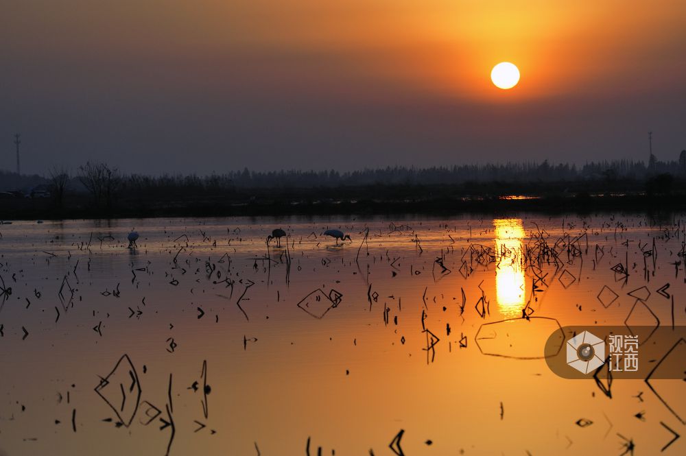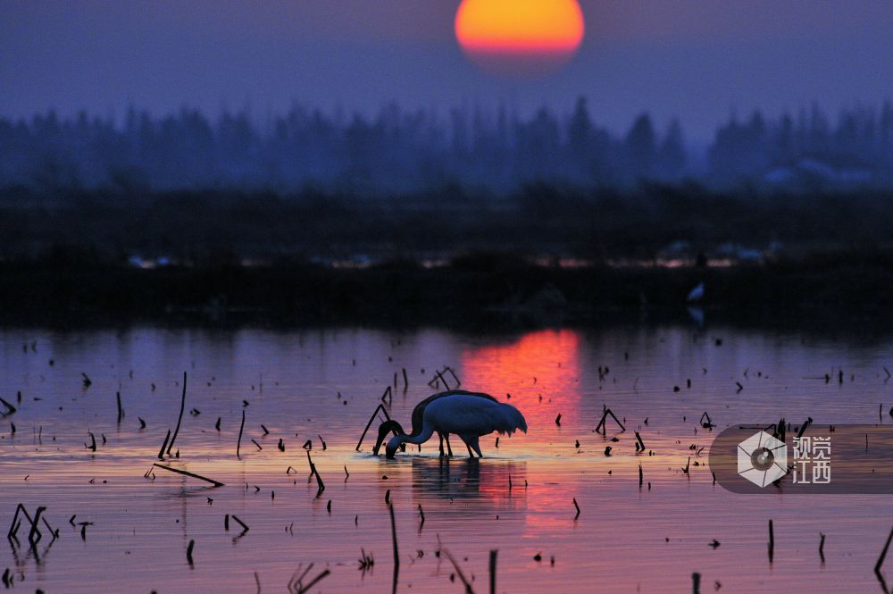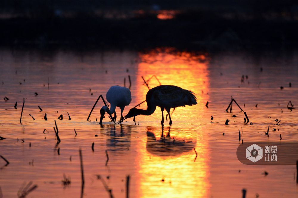 白鹤在落日余晖里归巢与觅食的迷人场景。
