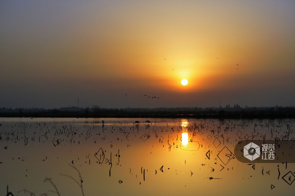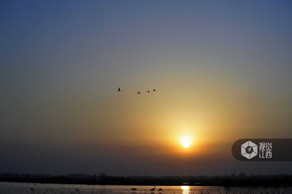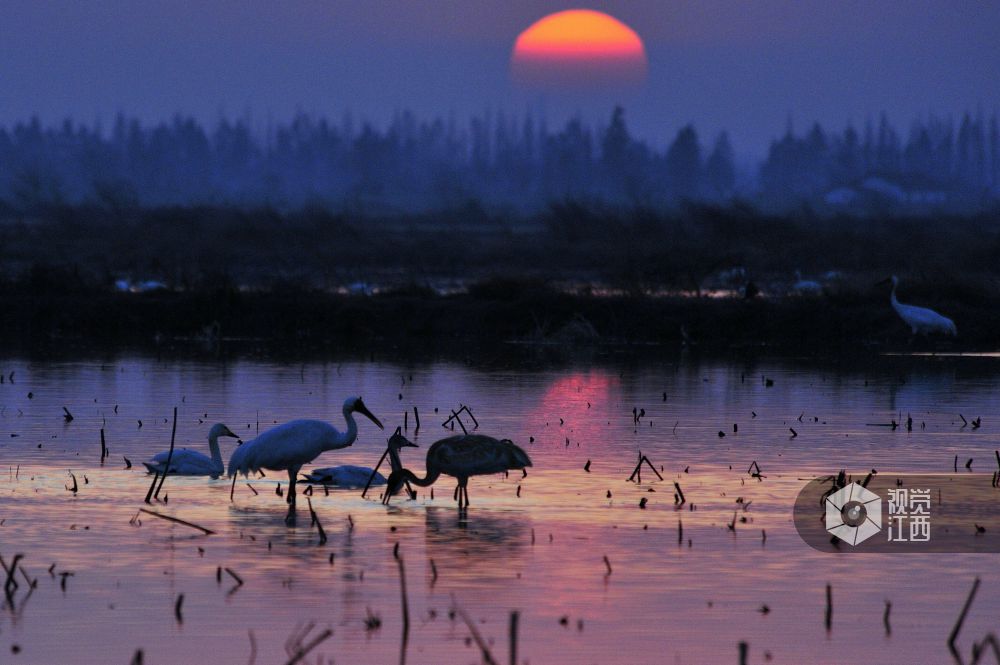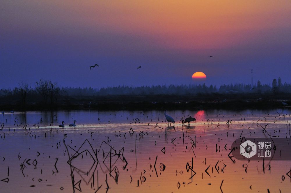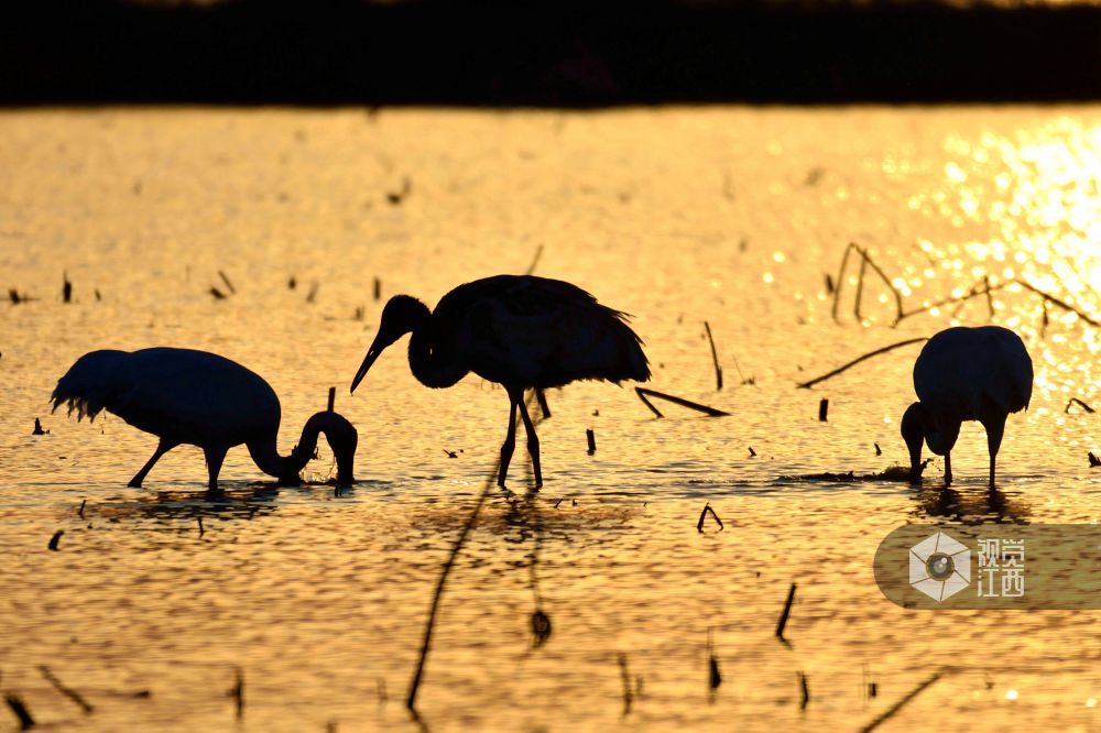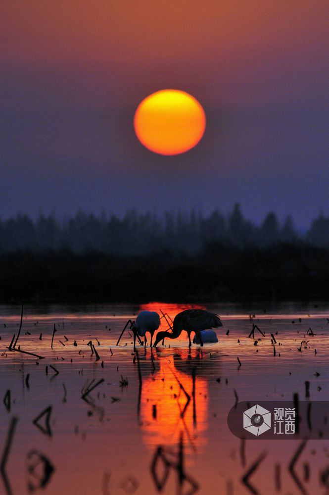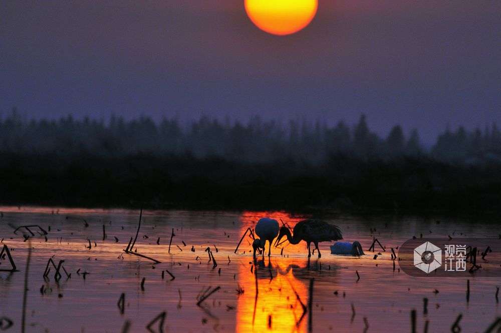 白鹤在落日余晖里归巢与觅食的迷人场景。