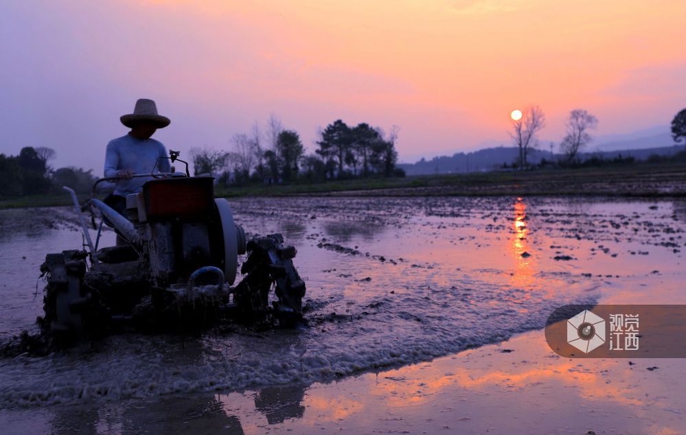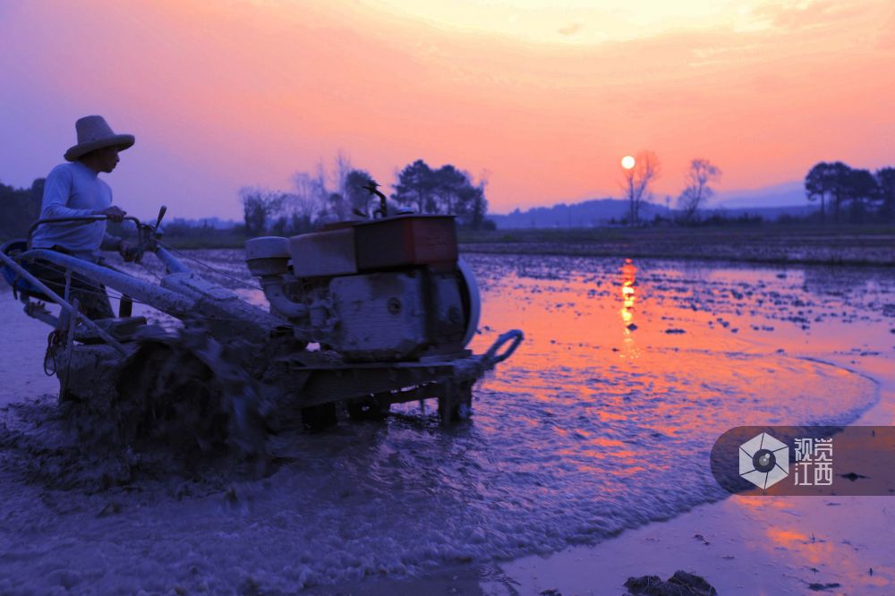 清明时节农耕忙4月1日,江西省安福县甘洛乡大郭村农民正在翻耕高标准农田。绚烂的夕阳下,勤劳的农民,奋进的铁牛,耕翻的水田,构成一幅别样的春耕图。2017年,安福县建设了5.3万亩高标准农田,经过重新调田后,该县农民迅速投入春耕生产。