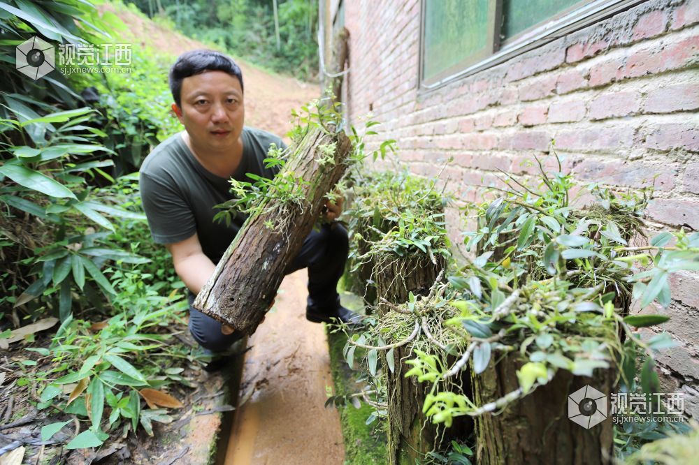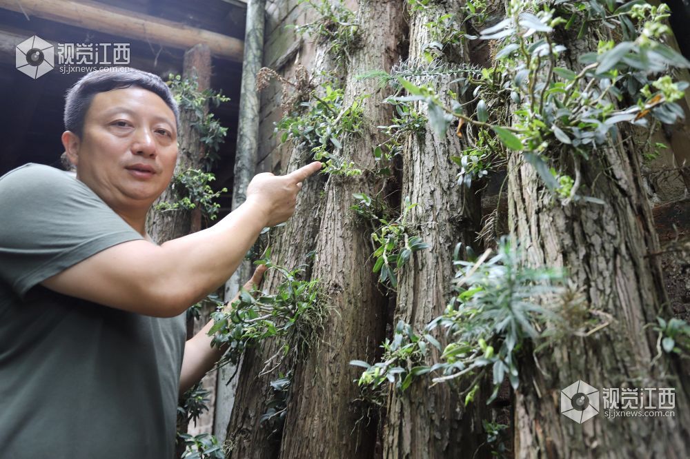5月29日,安福县山庄乡早禾田村的杨子江正在管理种在杉树上的铁皮石斛。2014年,杨子江、栁升禄从浙江返乡,在县公共就业与人才服务局、县扶贫办的帮助下,他们成功在杉树、杉木上种植仿野生铁皮石斛,并已收获第一批产品。今年,他把杉树、杉木仿野生铁皮石斛种植面积扩大到50亩,并于5月下旬陆续开花,花期将长达一个月。铁皮石斛是一种濒危珍贵药材,古代民间被誉为“救命仙草”,名列“中华九大仙草”之首,有“药中黄金”之美誉。杨子江、栁升禄介绍,他们准备建立铁皮石斛种植扶贫车间,帮助更多的贫困户脱贫致富。