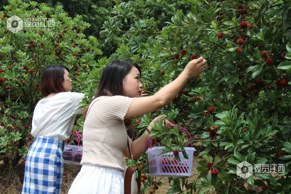 走进该杨梅基地探访时,络绎不绝的游客纷纷往杨梅基地赶,游客的欢声笑语使杨梅林充满了生机。放眼望去,漫山遍野的杨梅树上,朱红点点的果实、已是压满枝头,新鲜的杨梅果实,像一颗颗闪闪发光的红色、紫色玛瑙,晶莹饱满、让人垂涎欲滴。