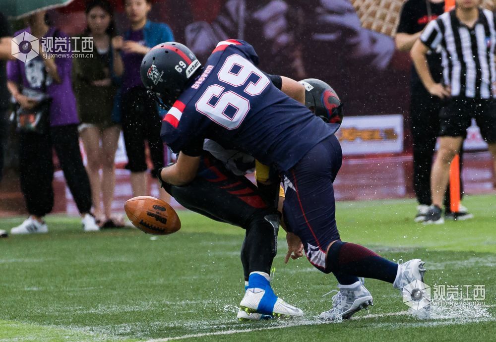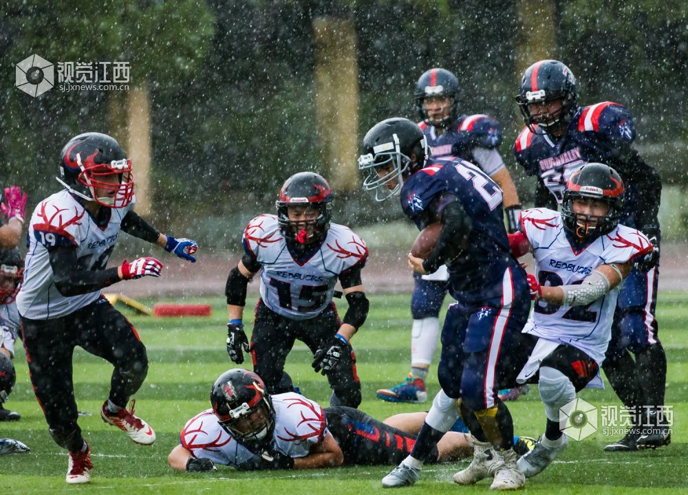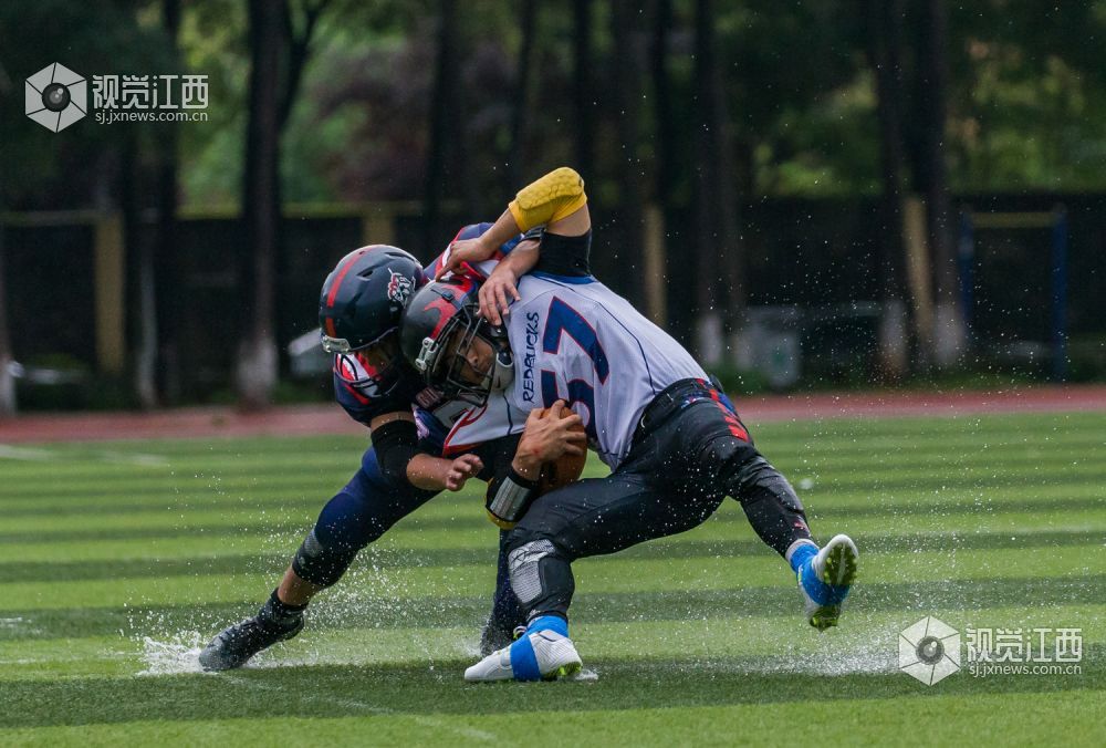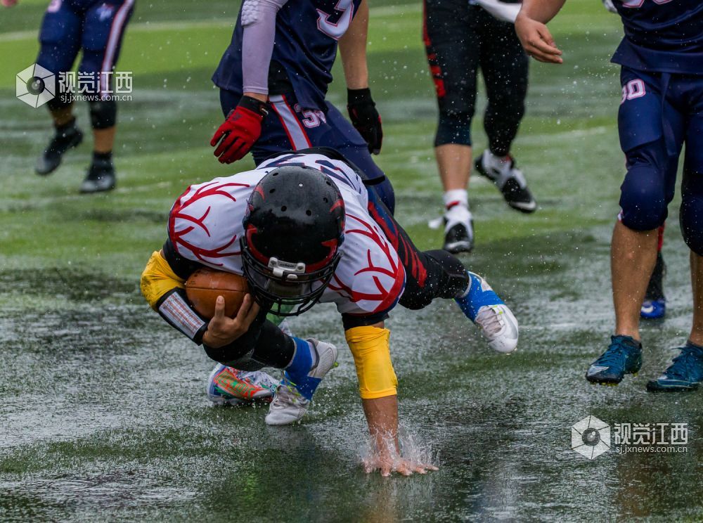 开赛前还烈日炎炎的南昌,瞬间便倾盆大雨。温州赤鹿首先向枪骑兵发起进攻,但很快被枪骑兵以强硬防守堵住缺口,没有获得预期效果。球权转换后,枪骑兵进攻组来到场上,直接利用线上体格和经验优势进行路面冲跑,通过中路和边路的反复配合,拉扯温州赤鹿的防守阵型,最终通过21号小将邓柯的边路跑球拿到本场比赛第一个达阵得分,枪骑兵先声夺人。