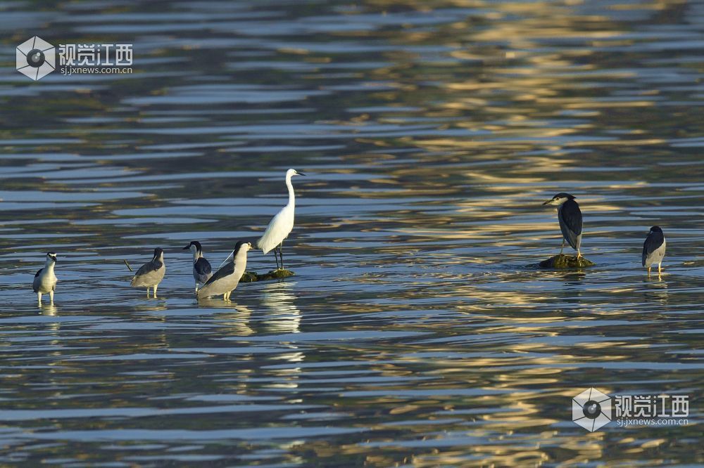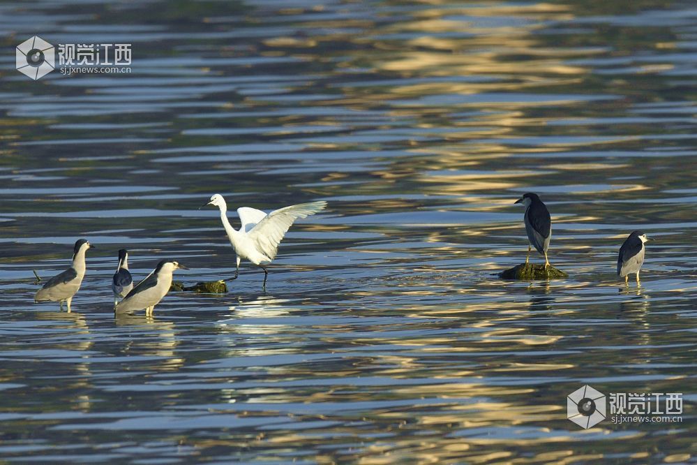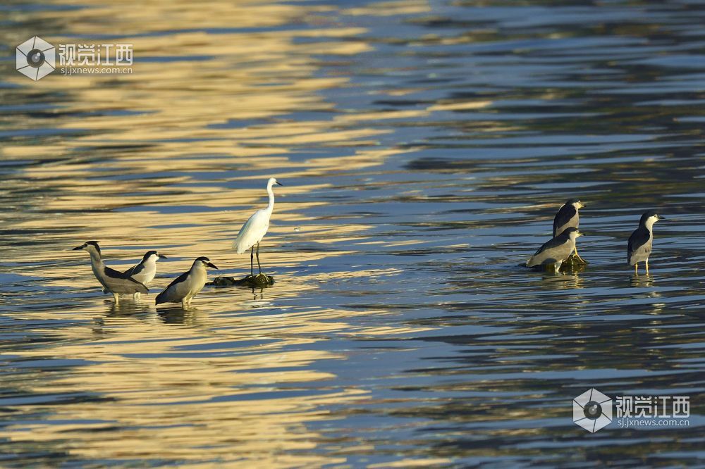 清晨时分,南昌艾溪湖湖面上的美丽光影与鸟儿。