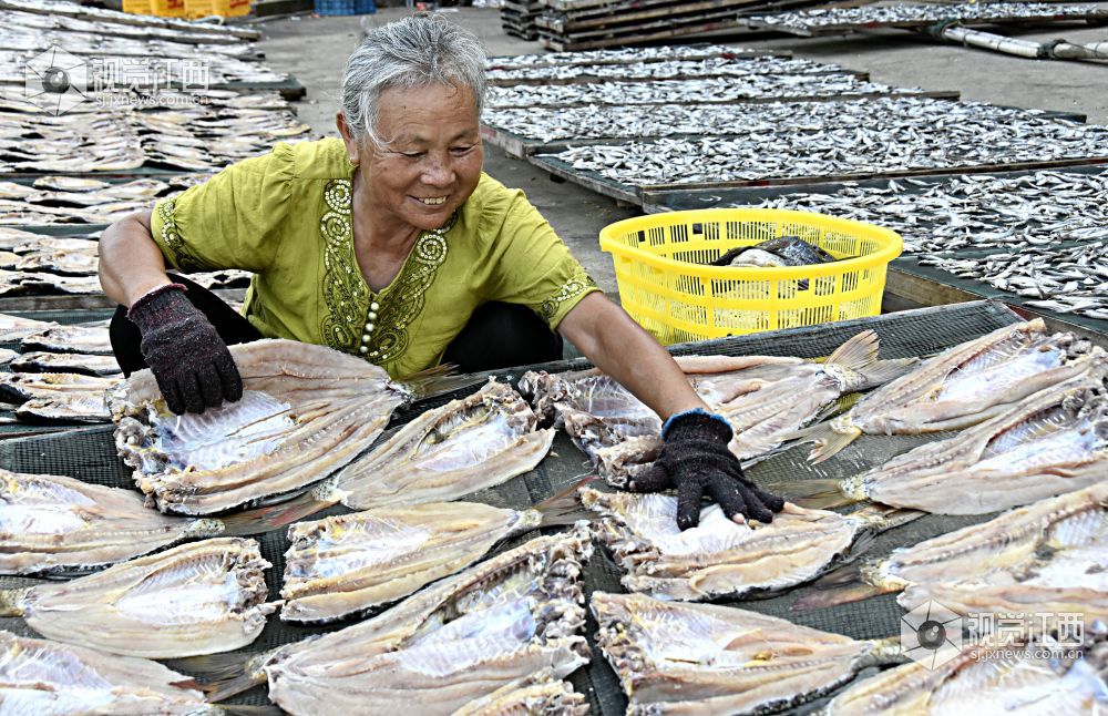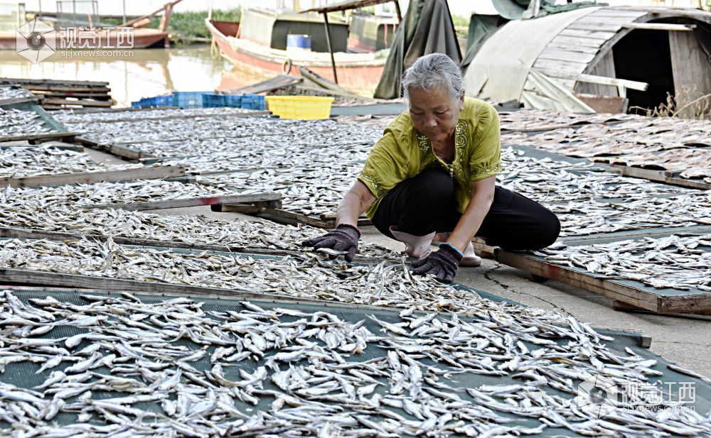 8月14日,鄱阳县管驿前渔村渔民正在把储藏的各种鱼品晾晒。该渔村地处鄱阳湖东岸,立秋后正是一年中晾晒鱼干片的黄金时间,由于他们的水产品来自鄱阳湖,因此很受消费者青睐。
