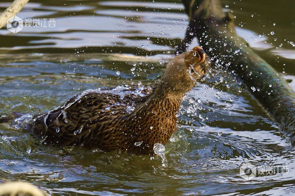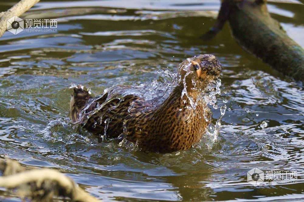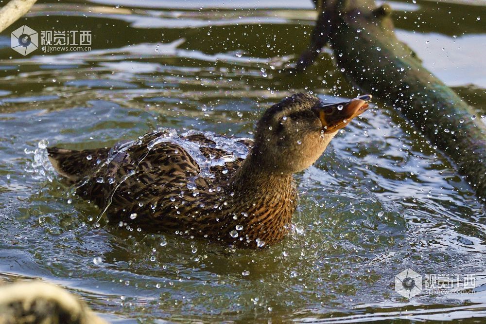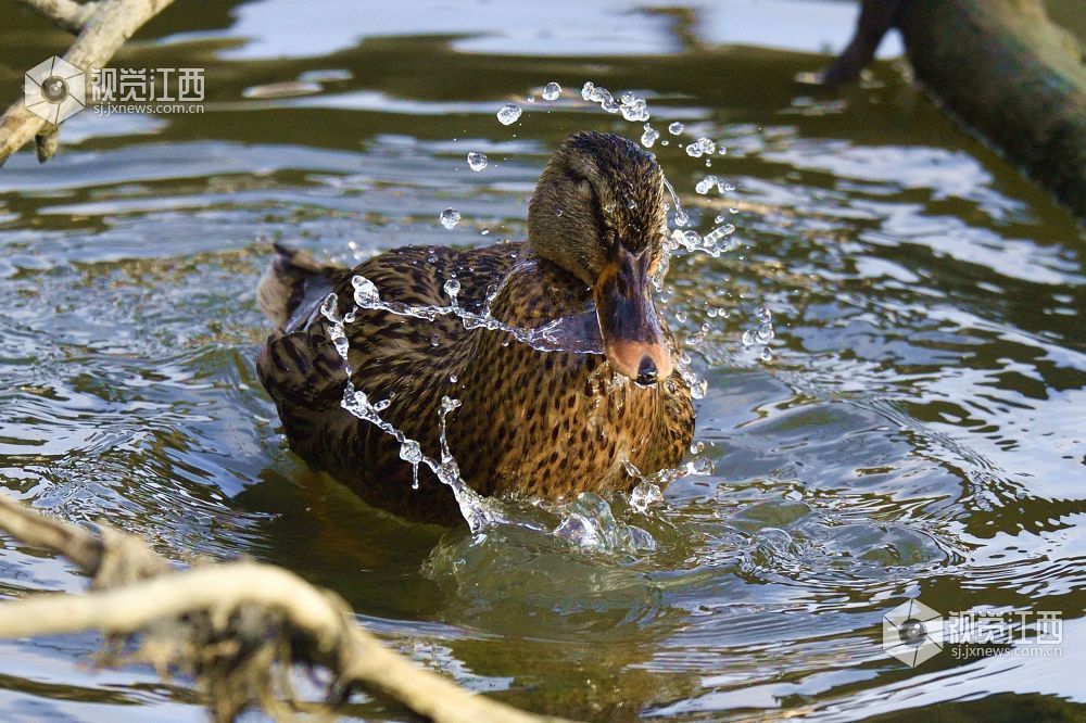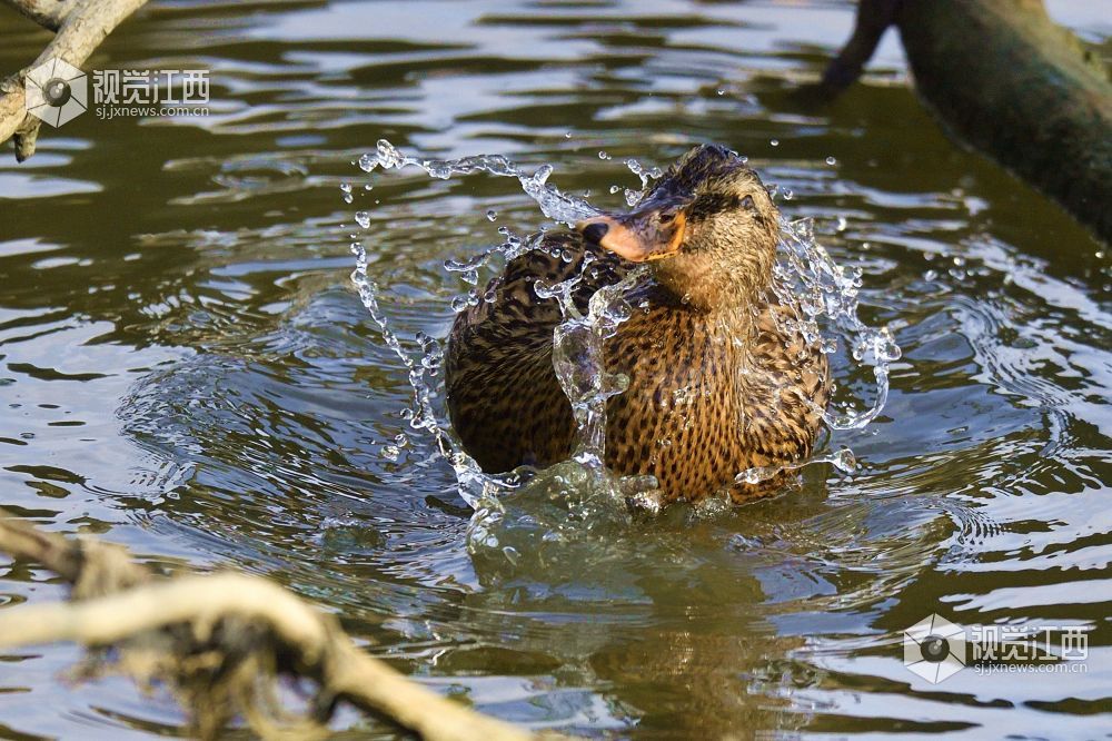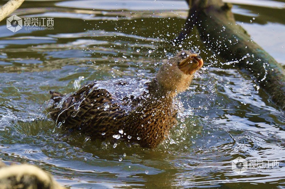 一只斑嘴鸭在水面尽情的冲凉、清洗。