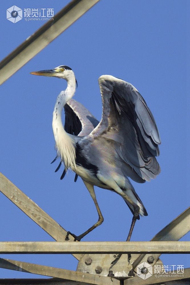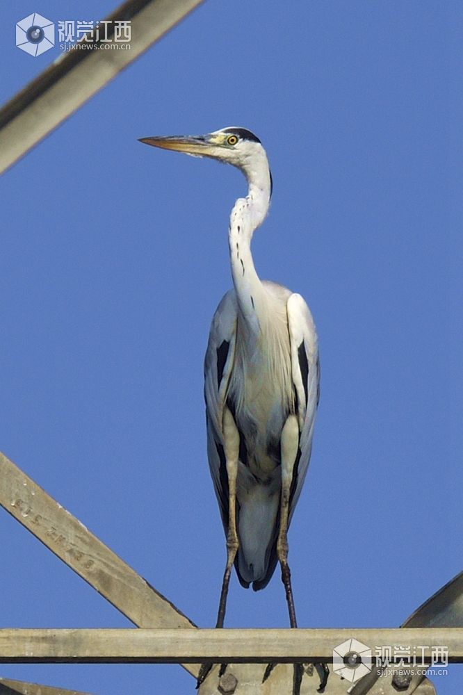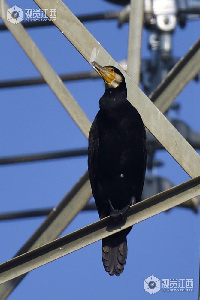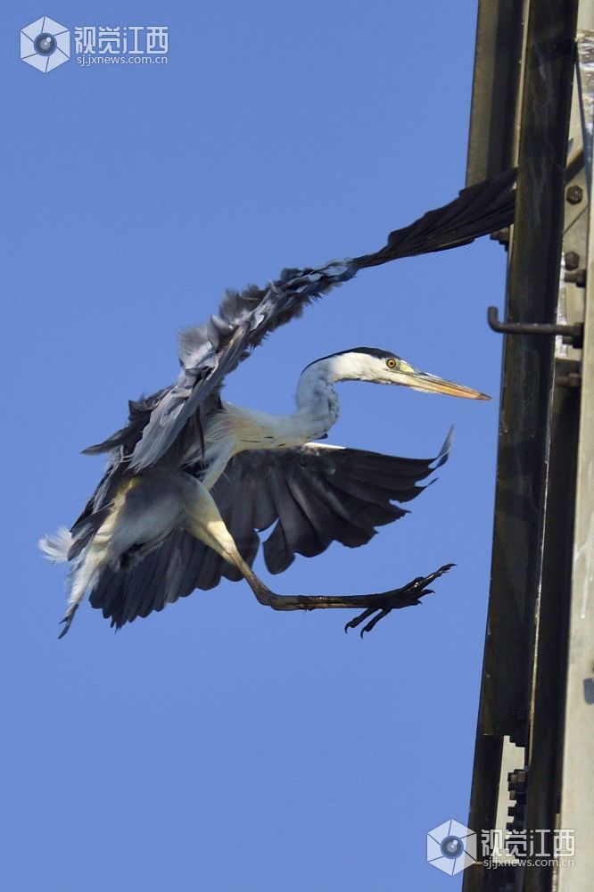 难得一见,一只鱼鹰与一只苍鹭停留在高压输电的钢架上。