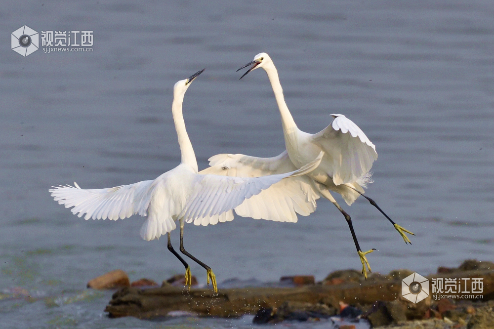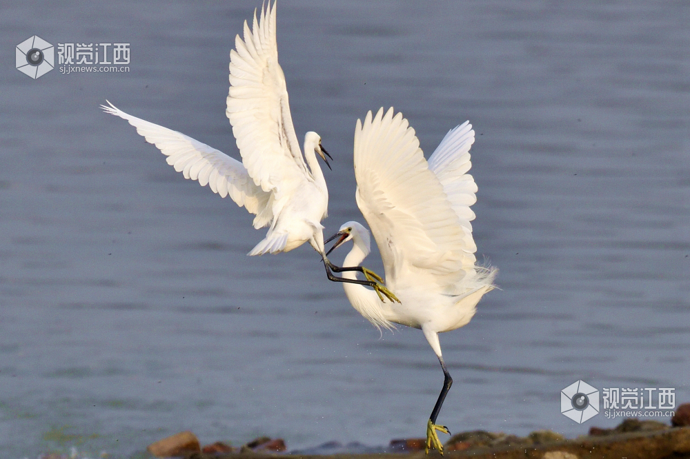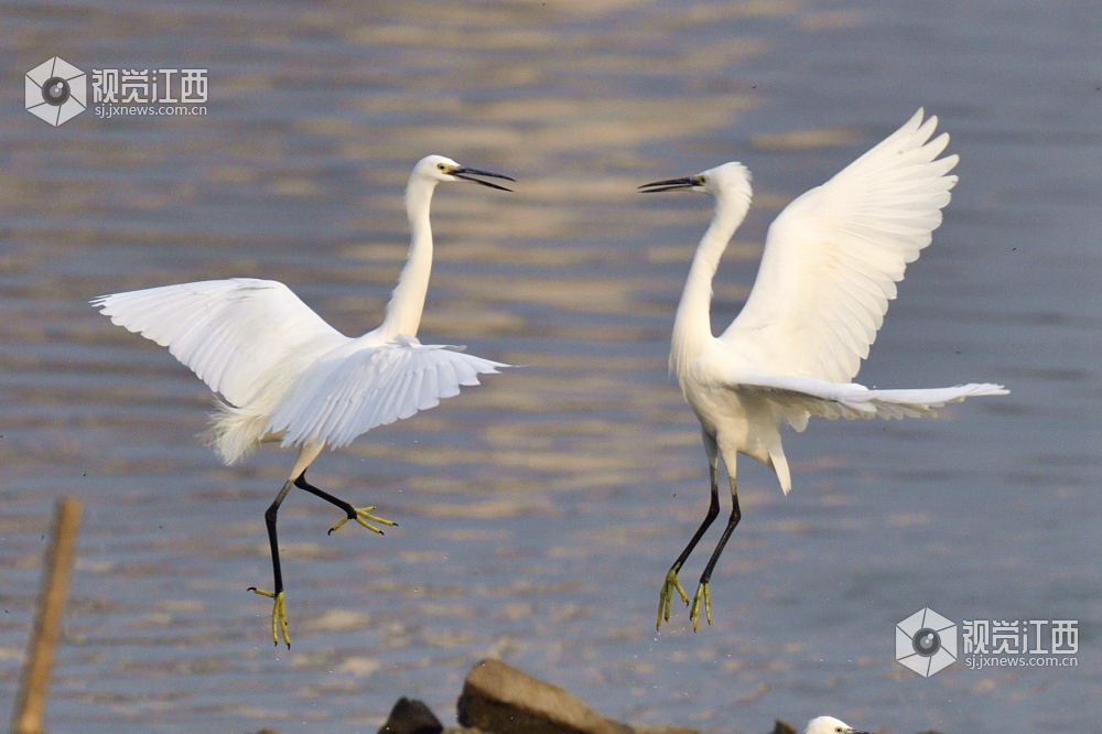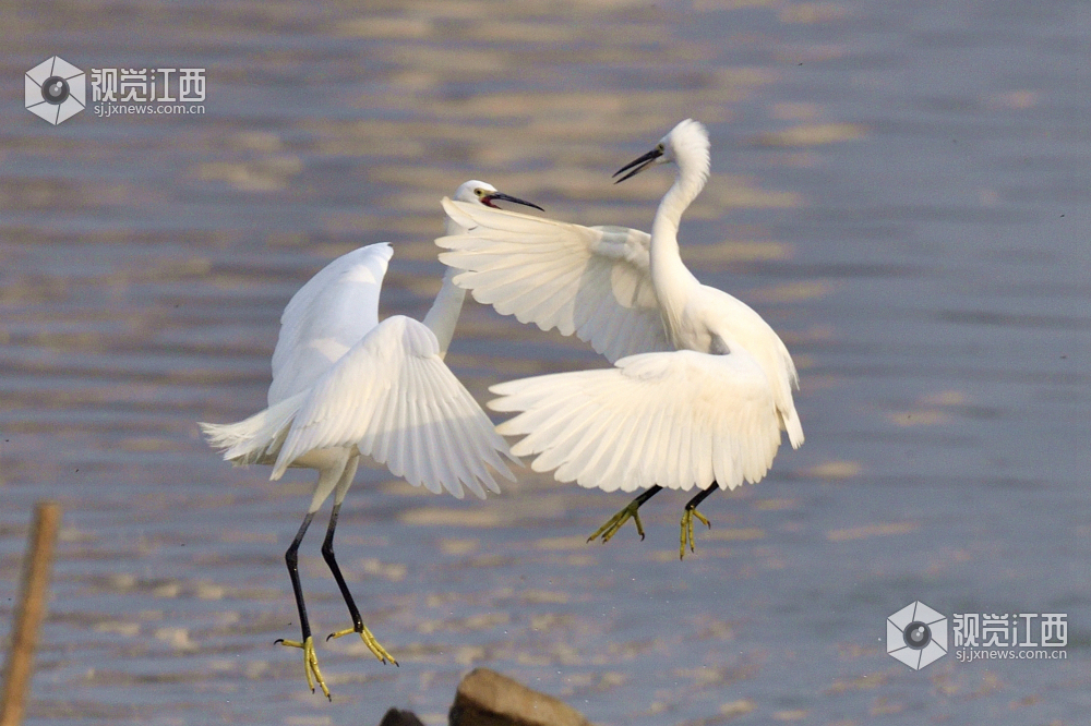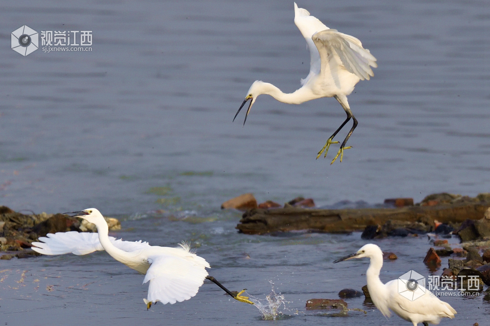 一群白鹭在艾溪湖的浅滩觅食,时常会发生激烈的打斗。