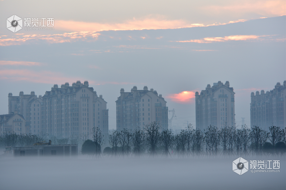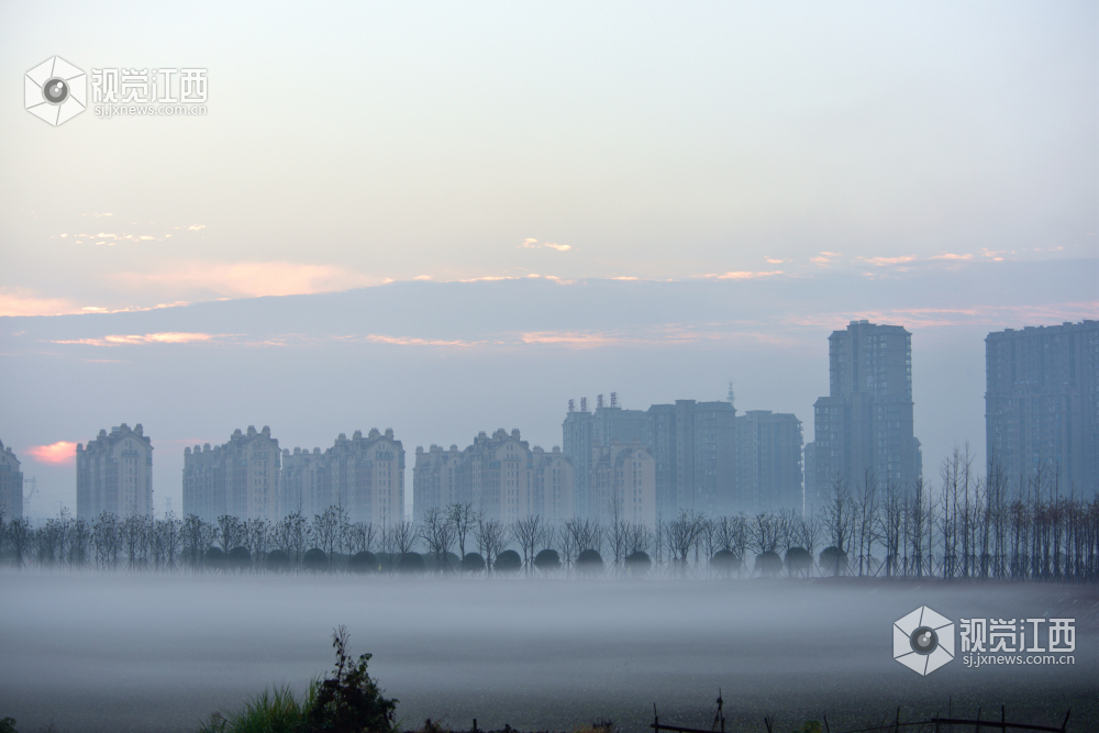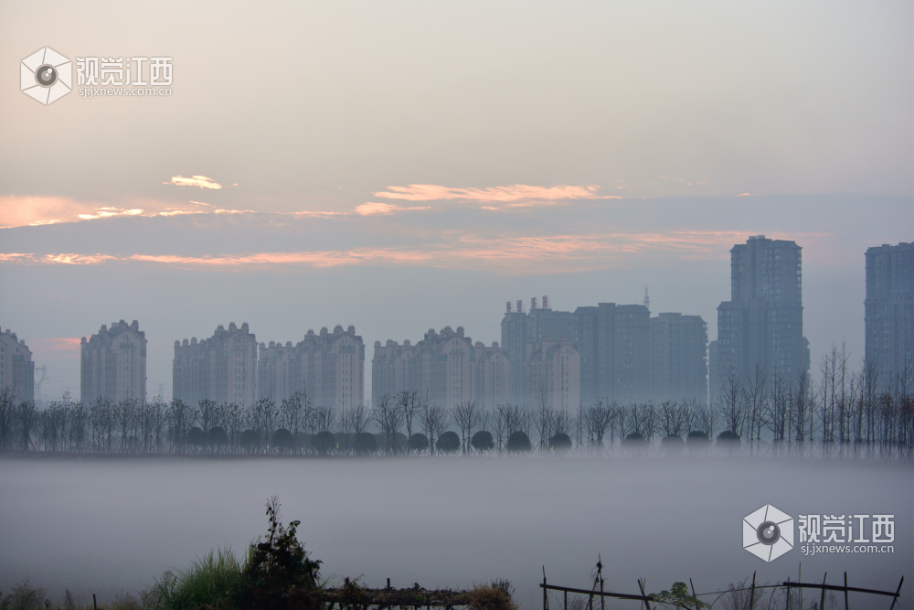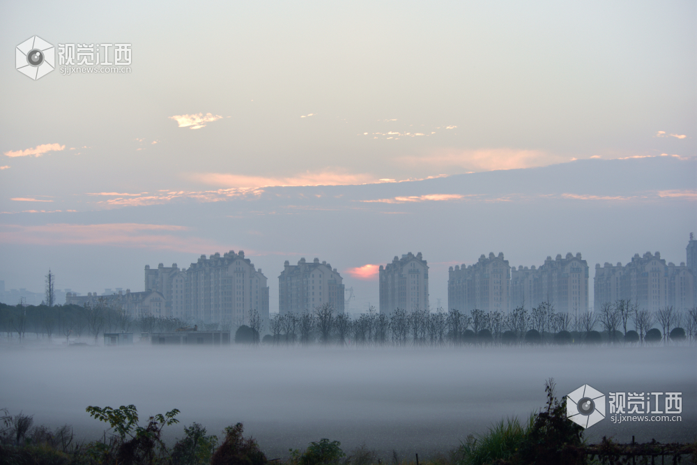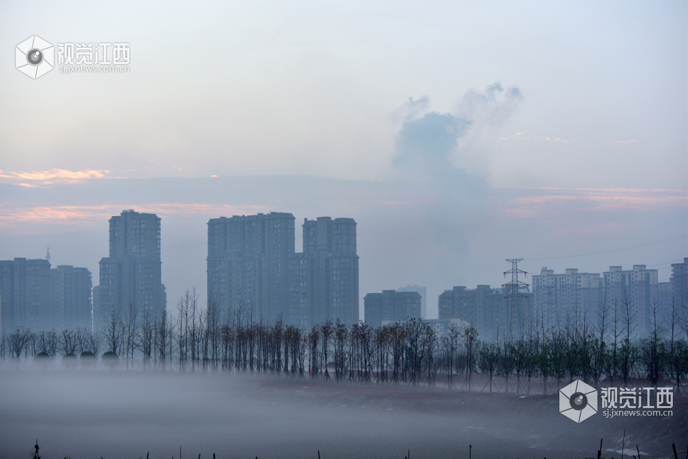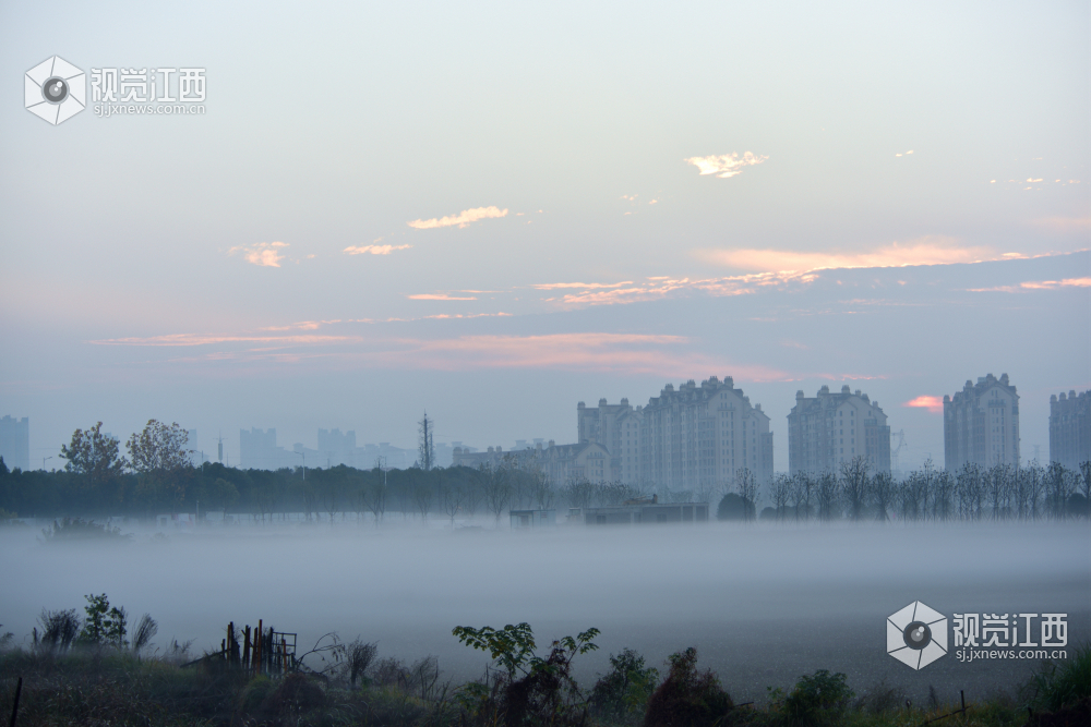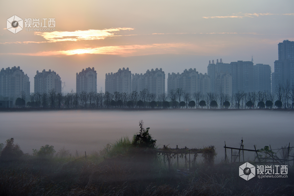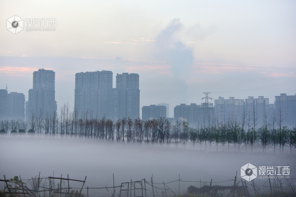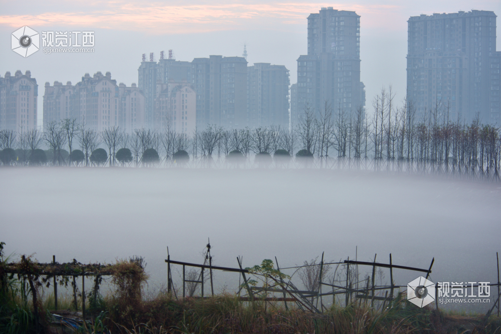 11月28日,在艾溪湖南路,忽见东边一处在建湿地侯鸟公园里的湖面满是云海般的晨雾,景致甚是迷人。