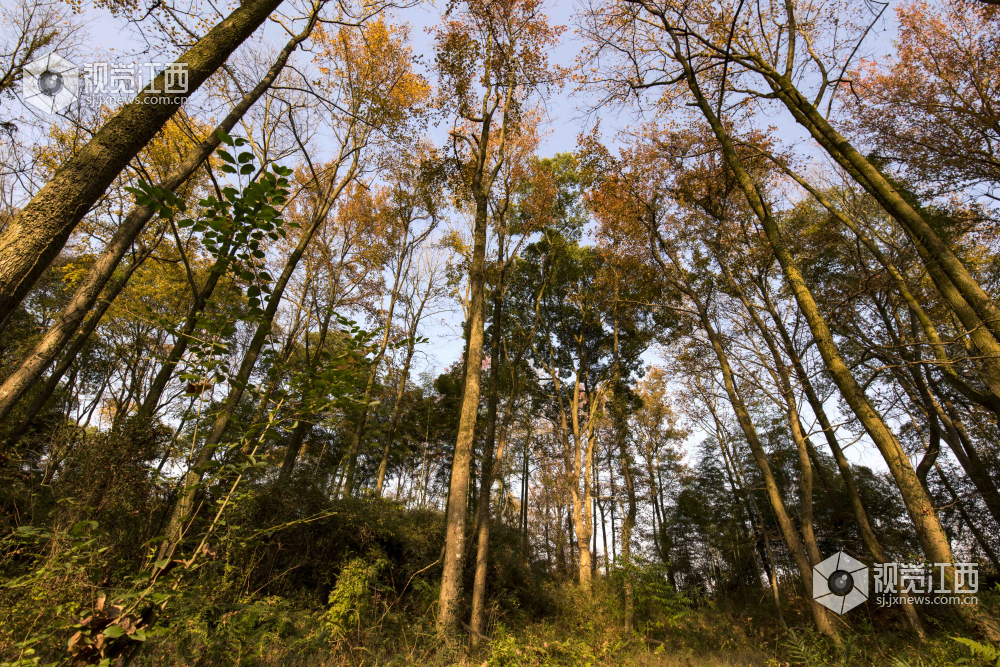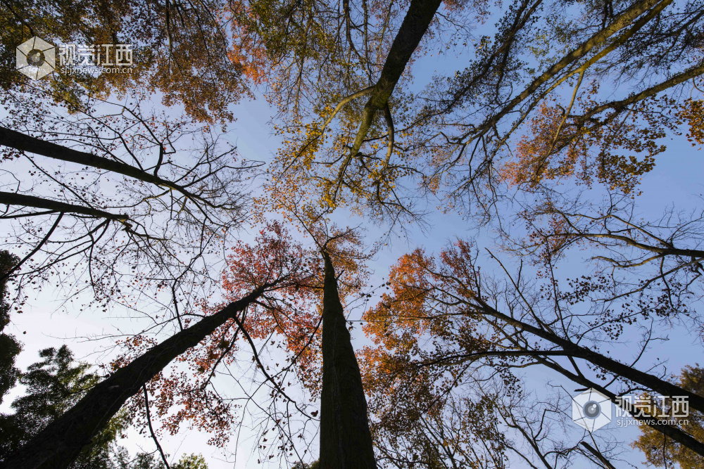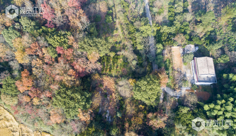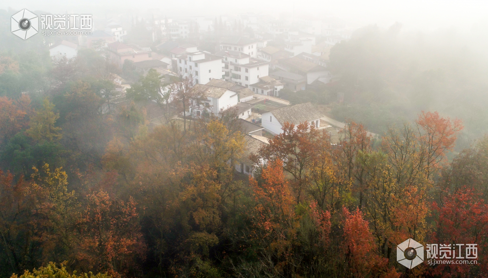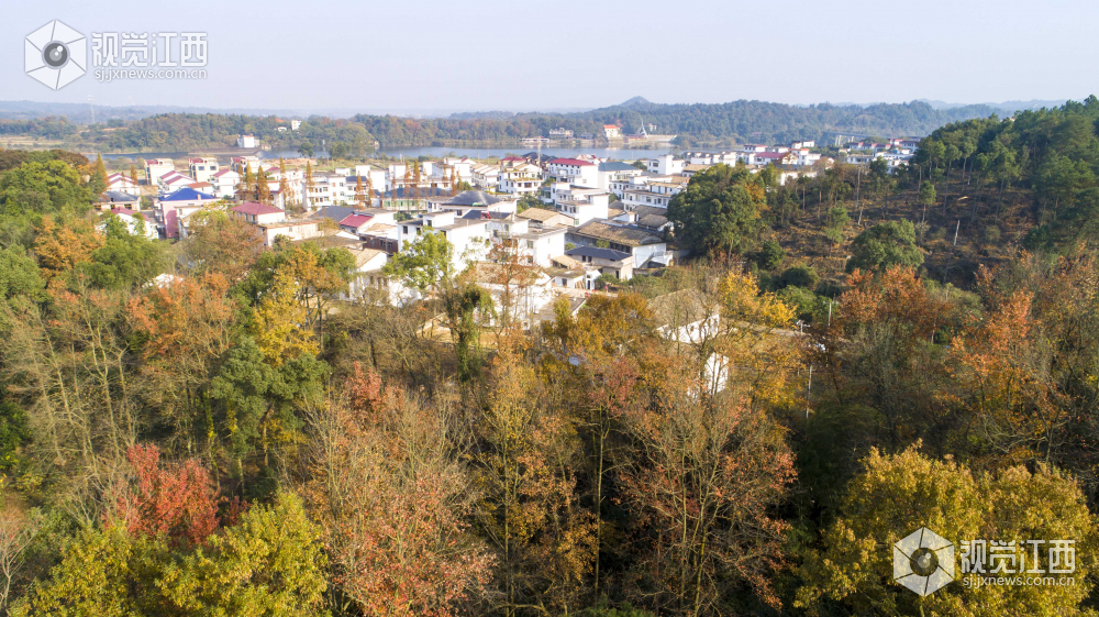 11月27日,新余市河下镇枫叶红了,村庄、房屋构成了一幅美丽的风景。