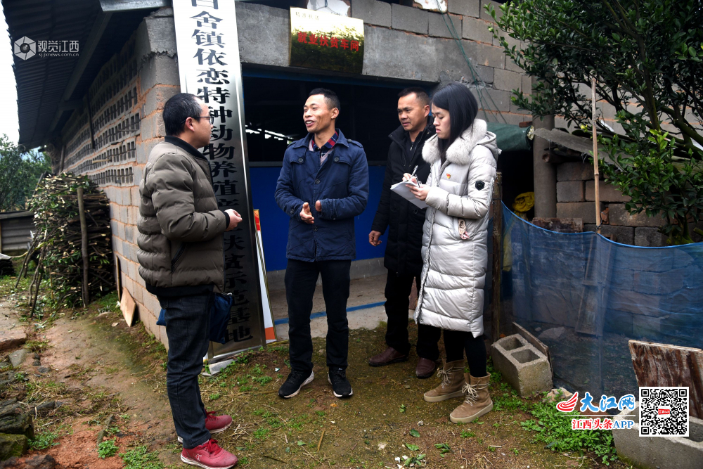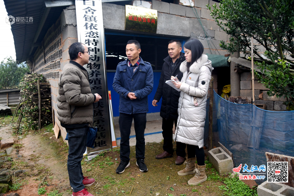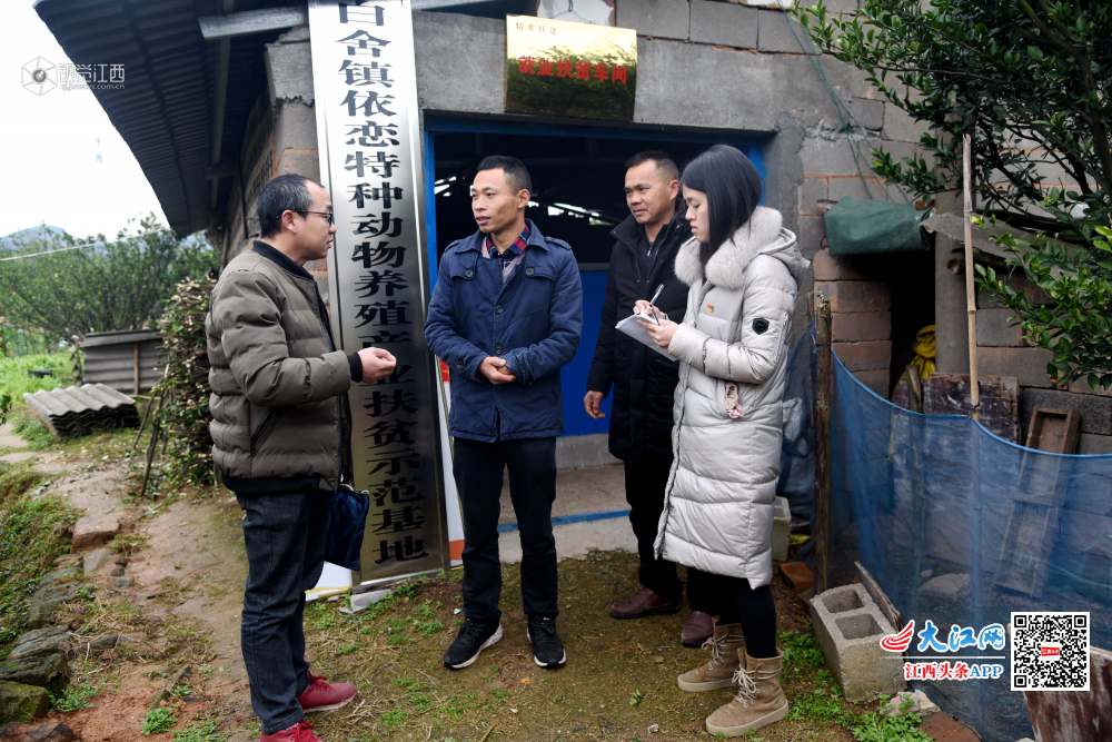 2019年2月15日,在南丰县白舍镇鄱阳村依恋特种动物养殖产业扶贫示范基地,县纪委监委干部在向建档立卡贫困户余东平(左2)了解扶贫资金发放情况。