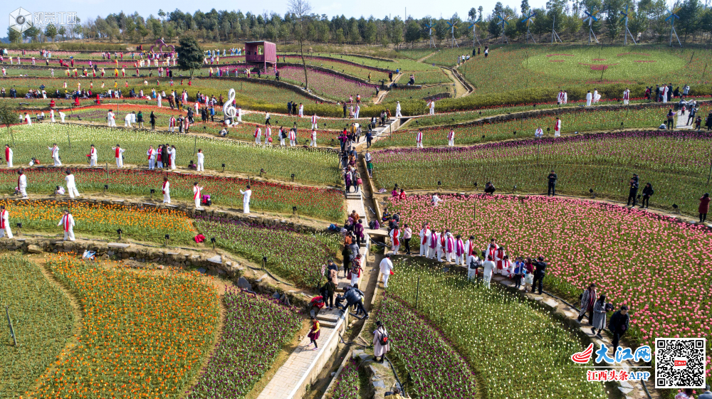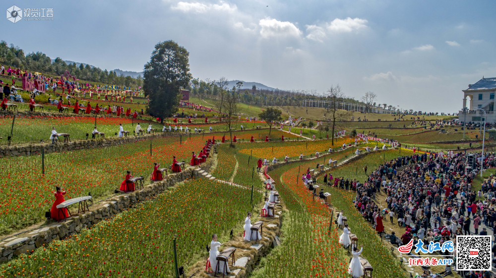 3月3日,新余市仙女湖区凯光植物园内春暖花开,逾千人在郁金香花海中旗袍走秀、太极、瑜伽、古筝、架子鼓表演吸引众多游客驻足观看。