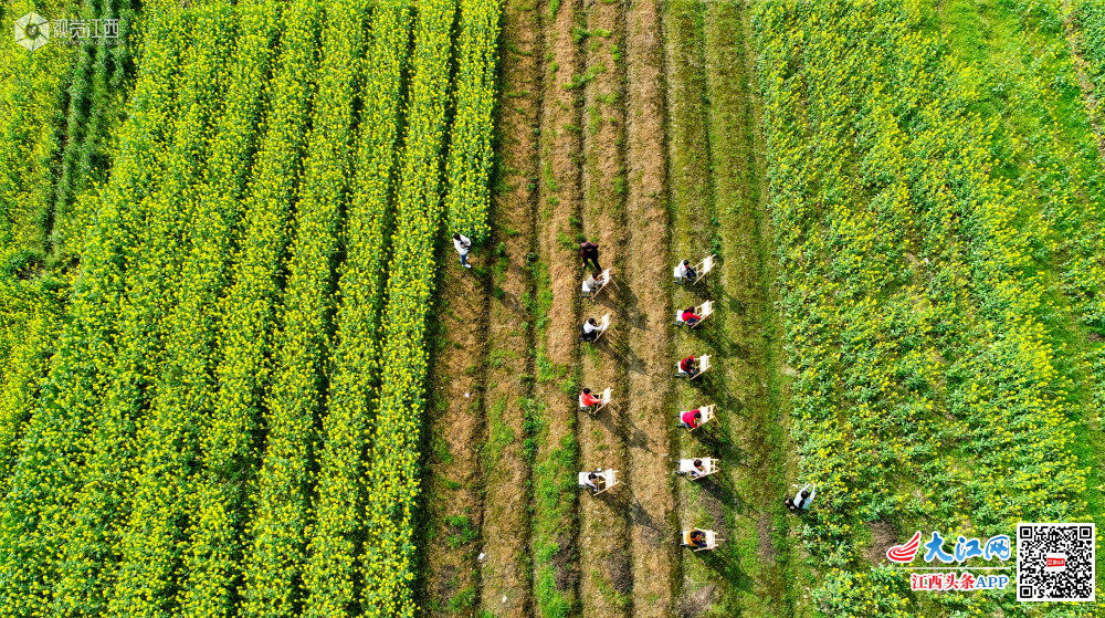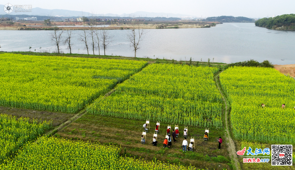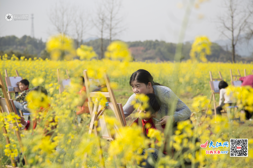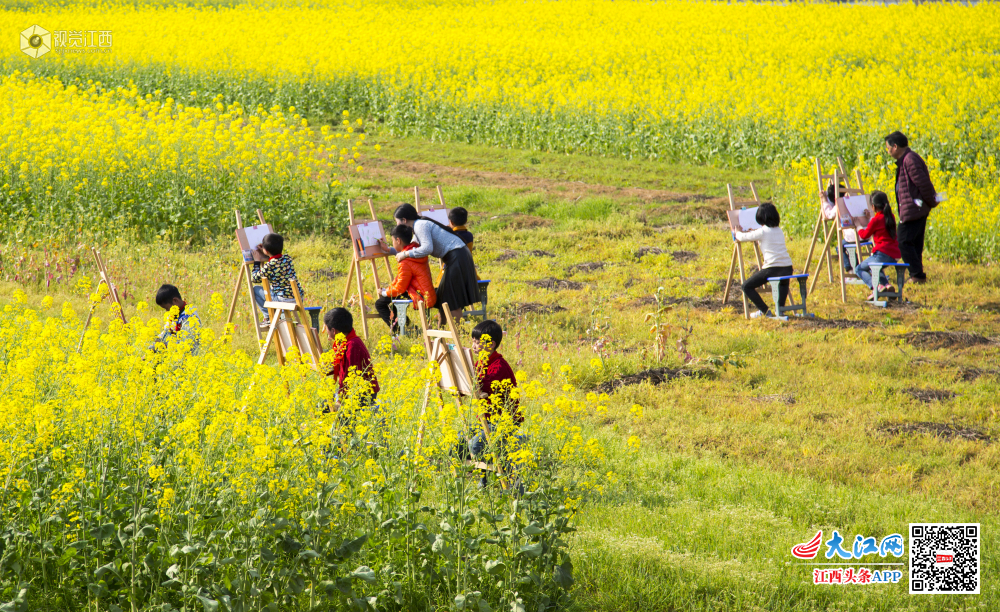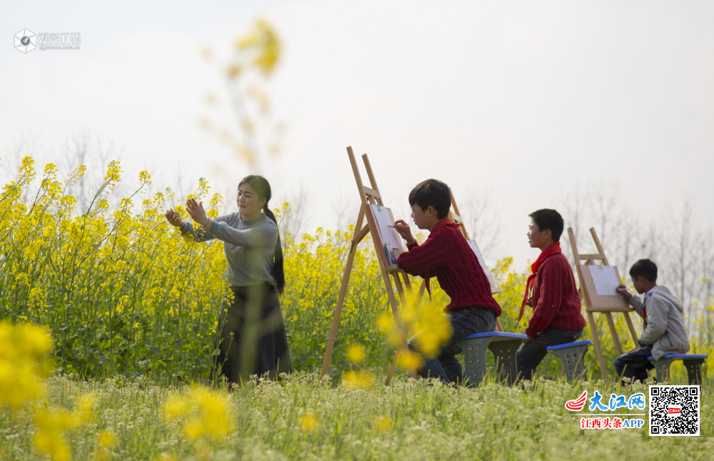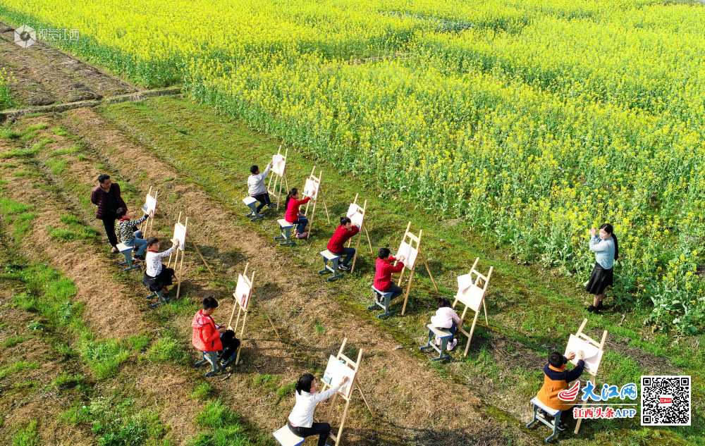 3月20日,新余市仙女湖区河下镇划江小学学生在老师指导下来到油菜花田写生。为让学生亲近自然,学校把美术课搬到油菜花田,在课本之外更多的开阔视野,开启多彩校外课堂,赢得孩子的喜爱。