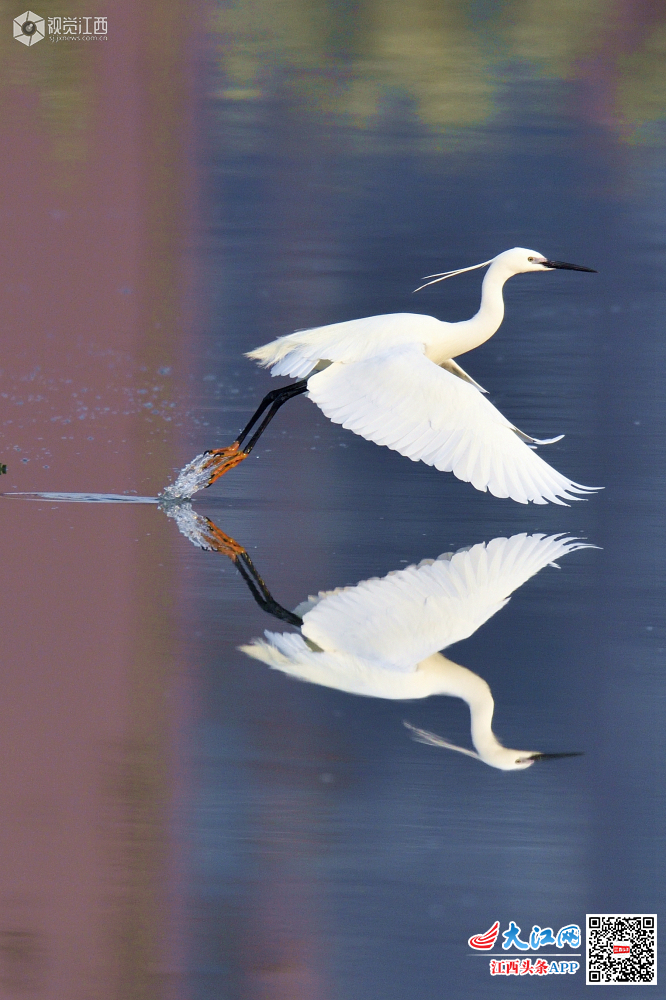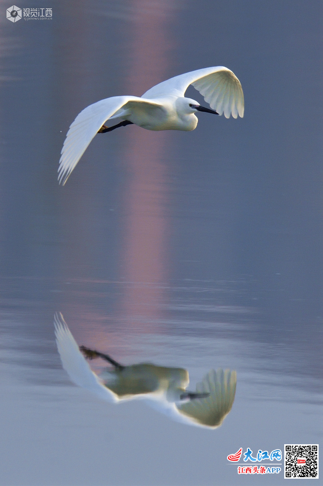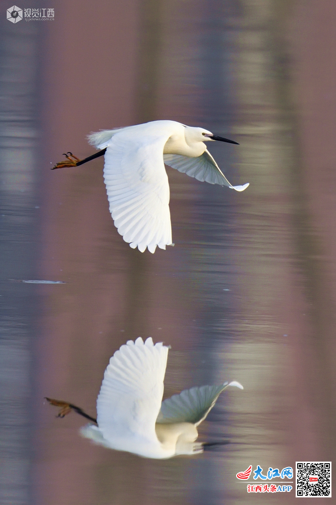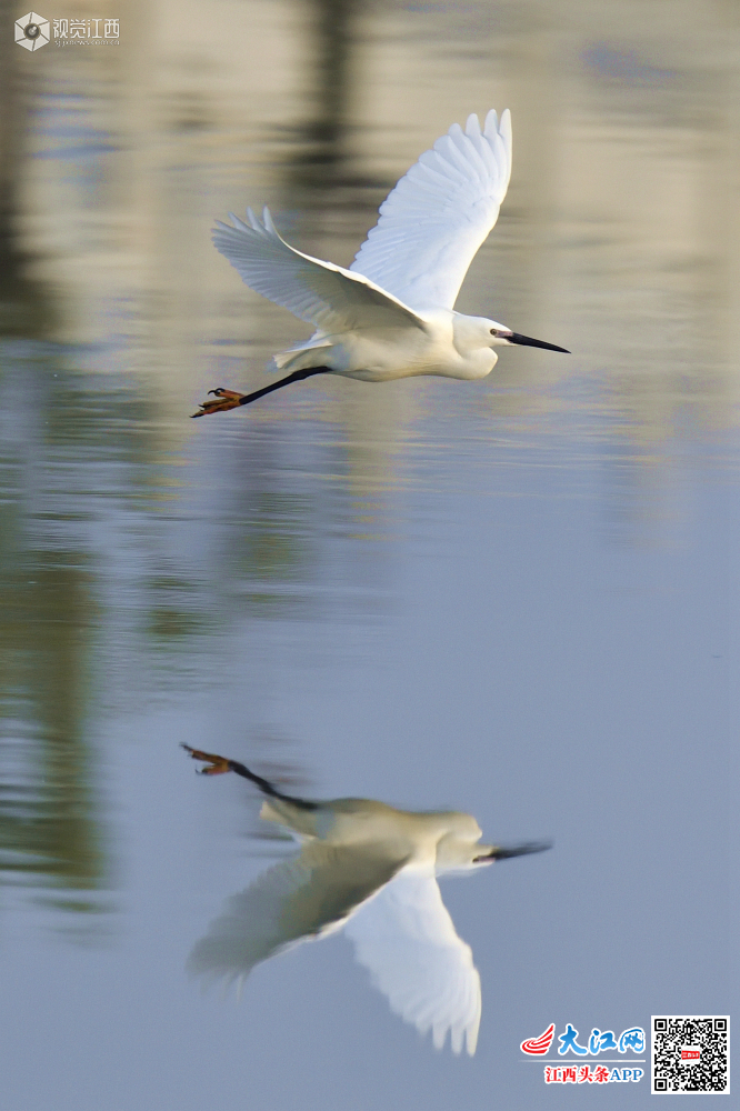 白鹭觅食时,常常贴近水面飞行,与水中的倒影组成的场景十分动人。