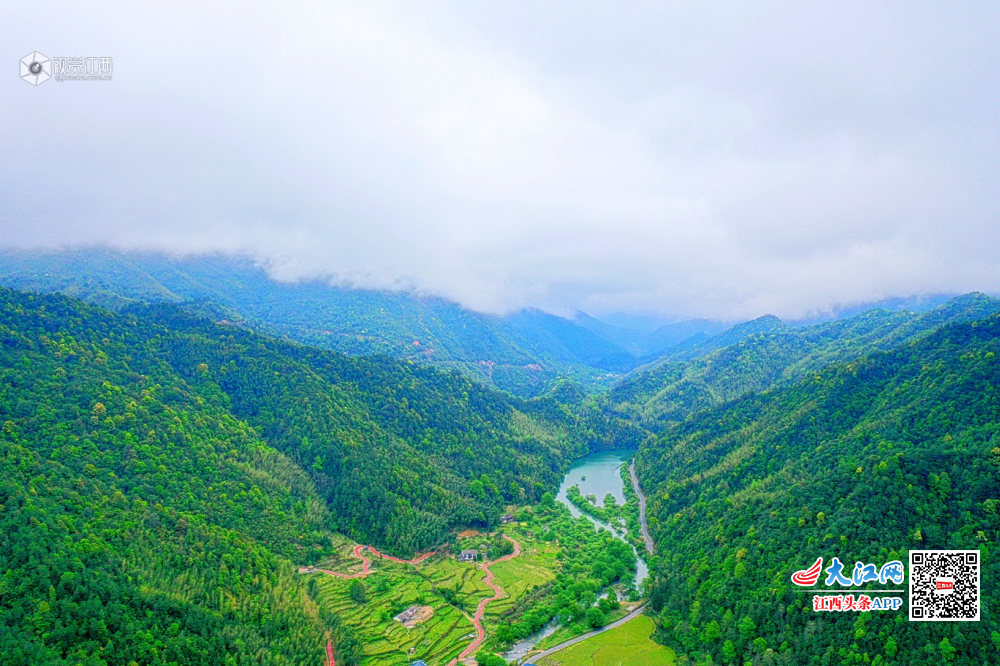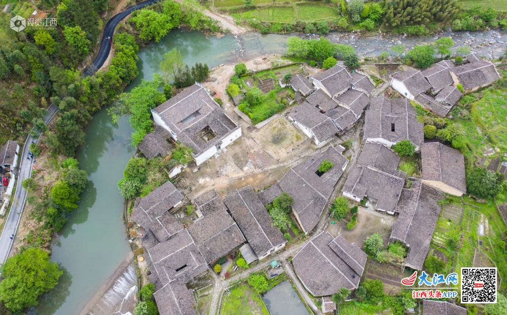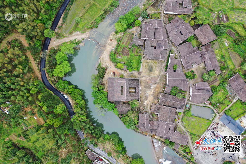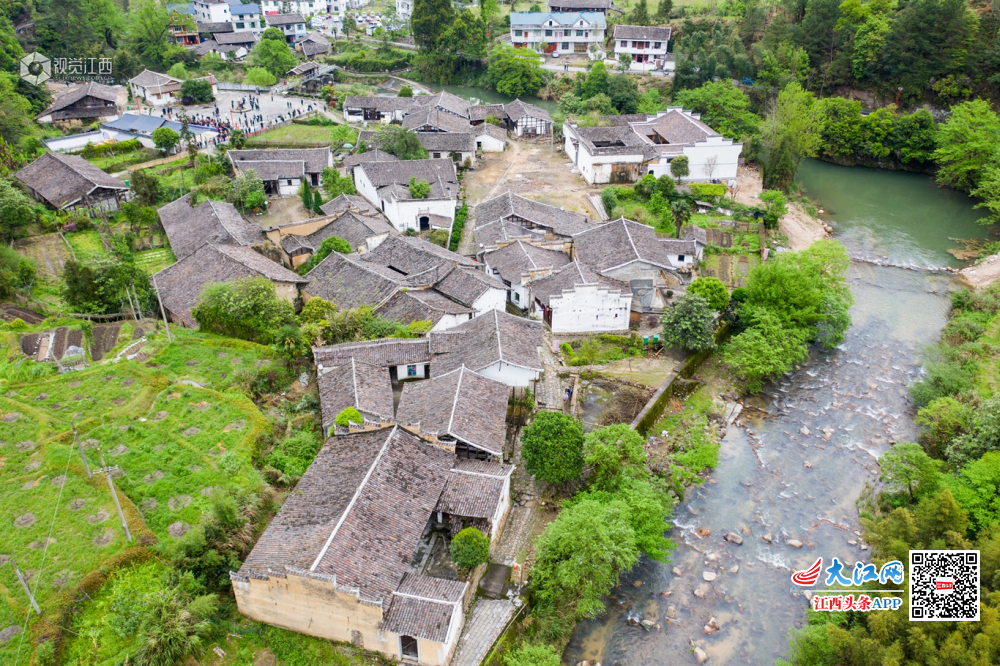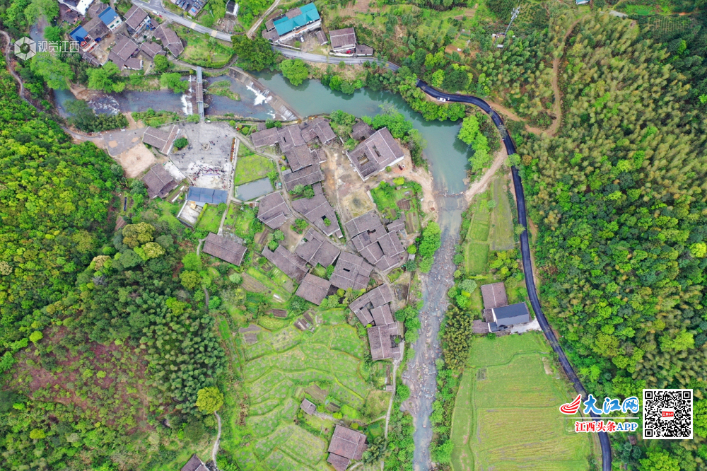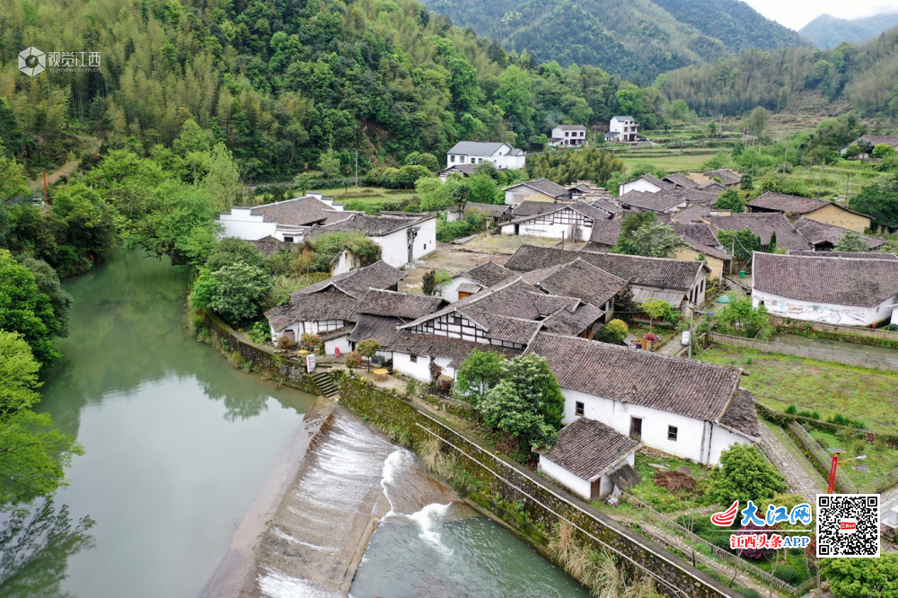 2019年4月10日,航拍江西省上饶市铅山县太源畲族乡水美村,该村大山环抱,古朴的村庄与周边的山水相映成趣,犹如山水画。