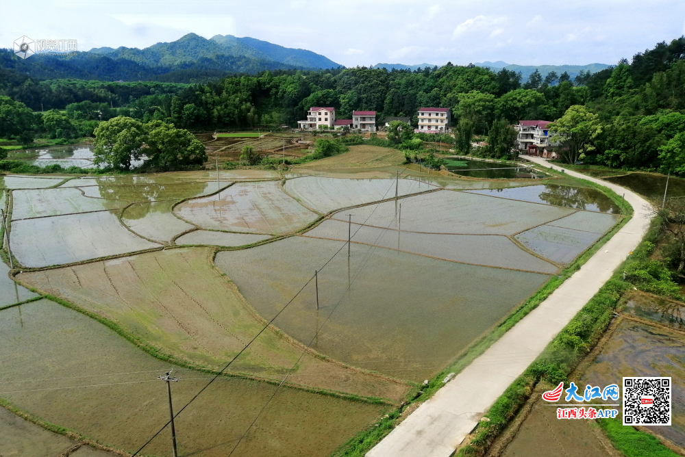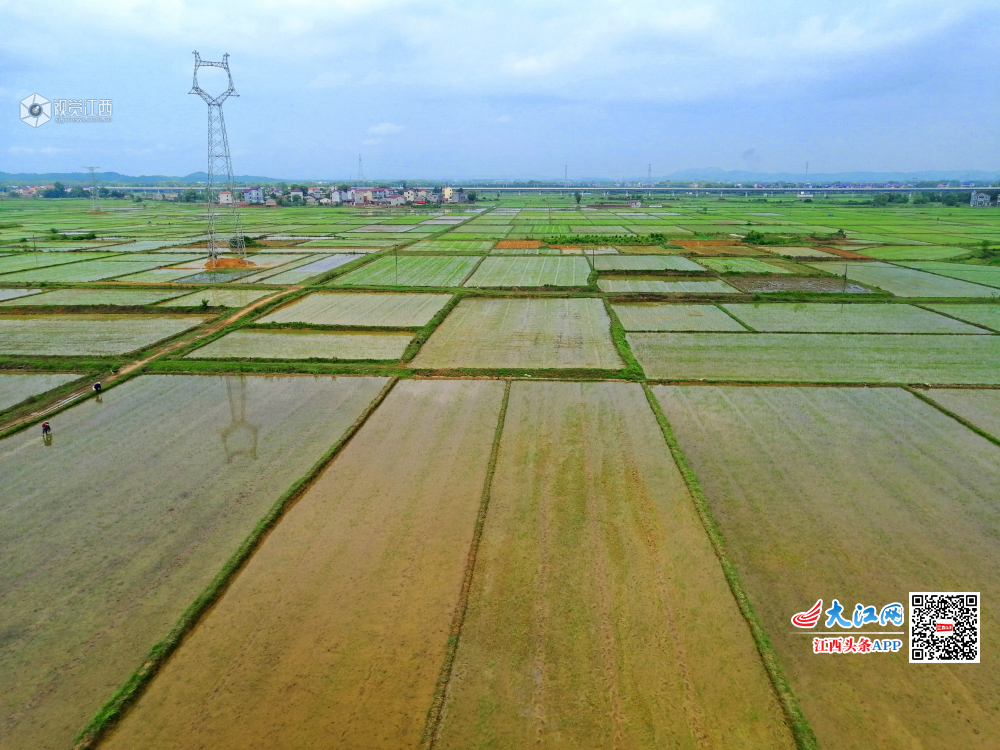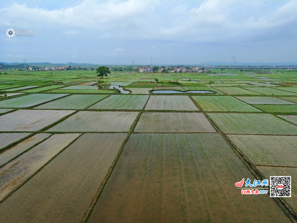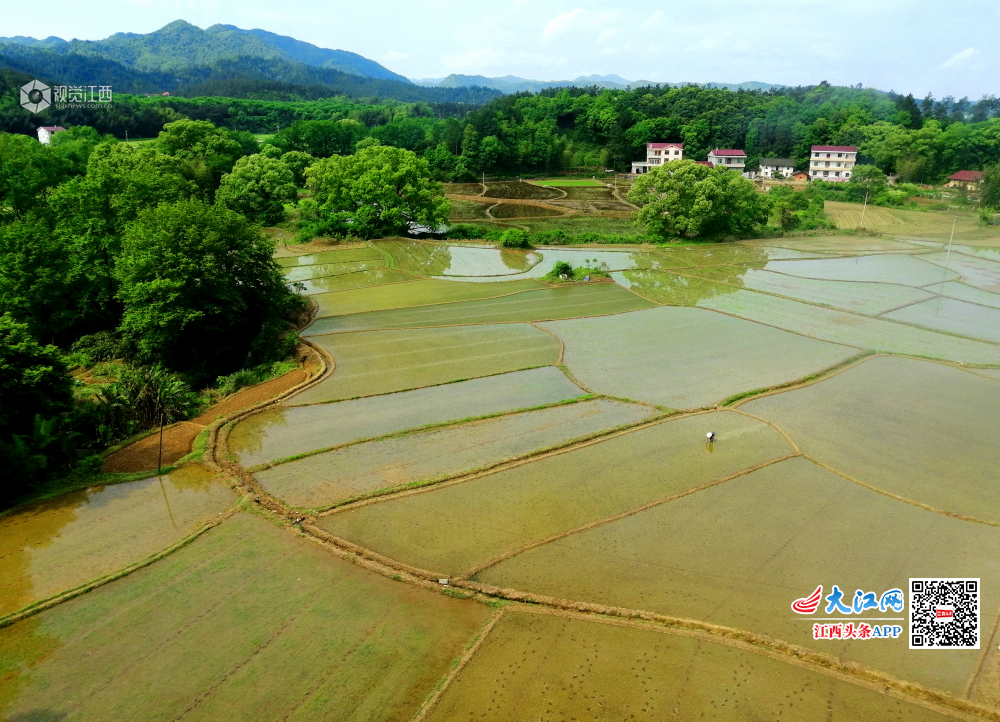 “谷雨春光晓,山川黛色青?!惫扔晔苯冢禄厣M嘉?019年4月20日俯拍的江西泰和县田园,如镜面般透亮的水田、泛着点点绿意的禾苗、蓝天白云和远处连绵的青山构成了一幅美丽壮阔的谷雨田园春光图。