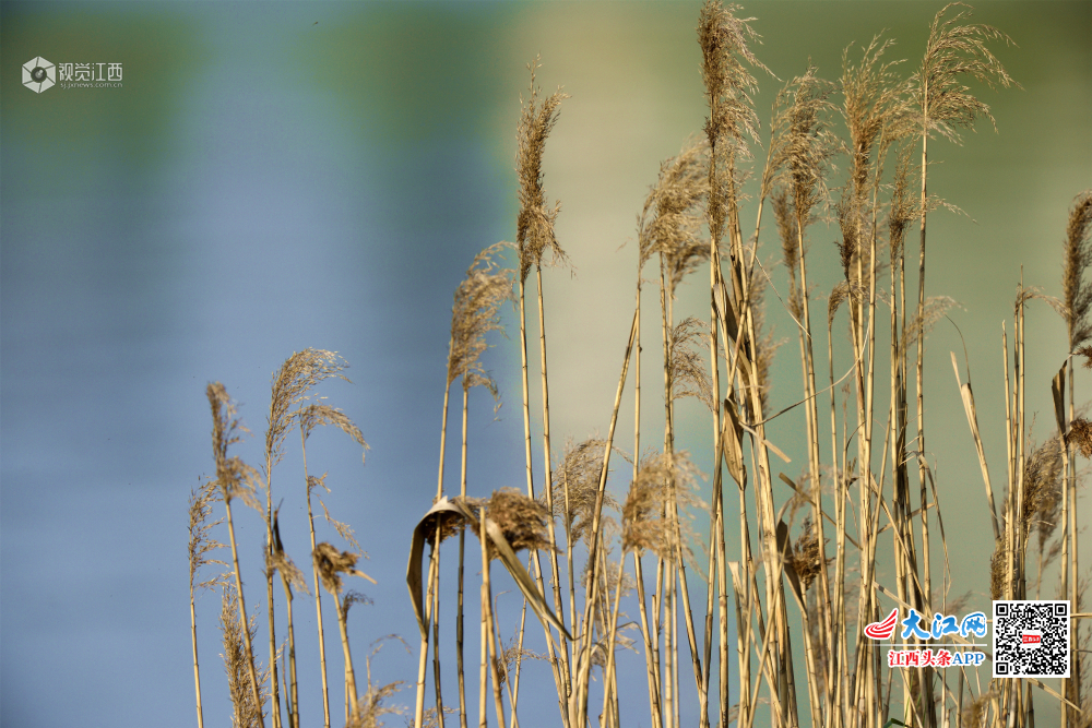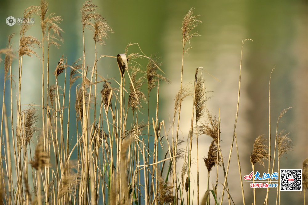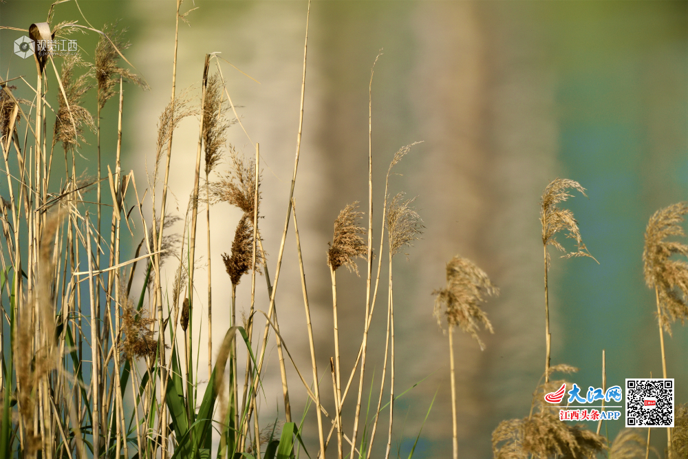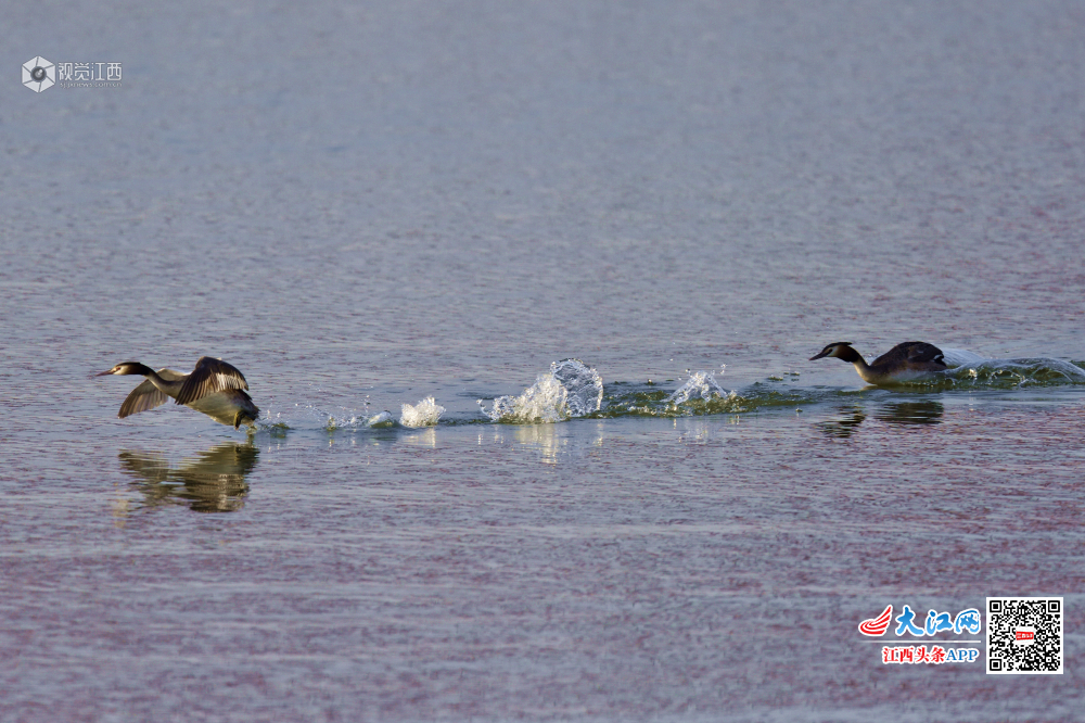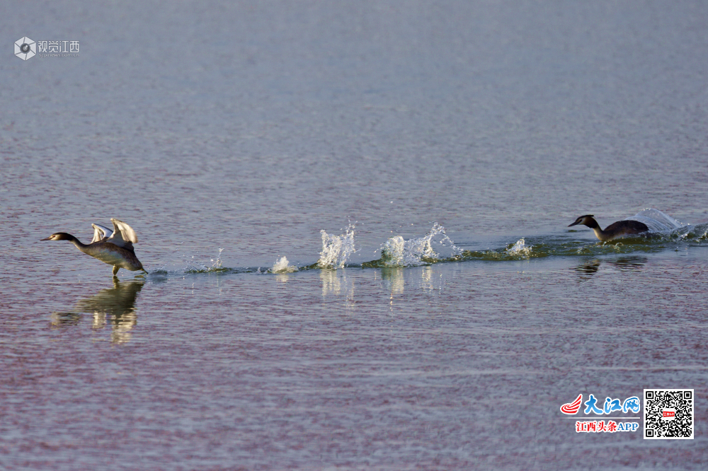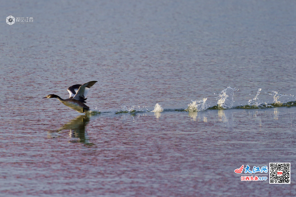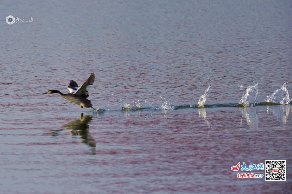 黄昏时分,由于阳光的照射,艾溪湖水面上色彩斑斓,水鸟也十分活跃。
