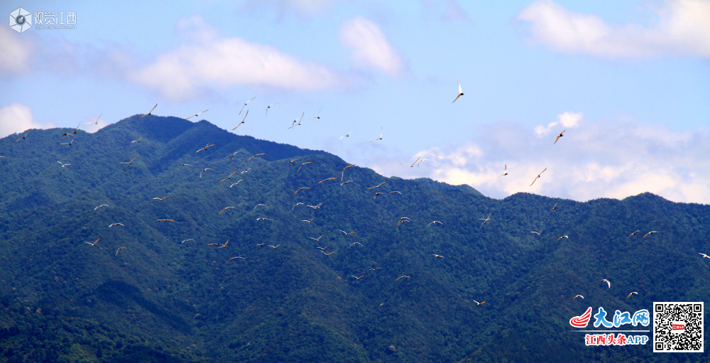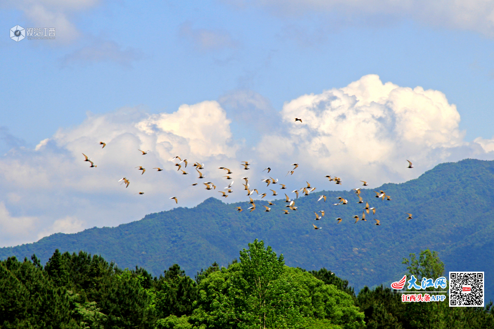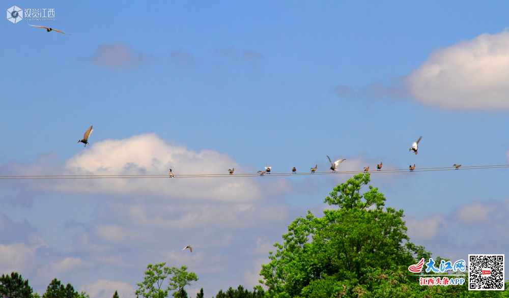 4月25日,江西泰和县紫瑶山下,一群群鸥鹭振翅高飞,时而向上盘旋,时而向下俯冲,时而整齐排列在电线上,与蓝天白云和青山绿树构成了一幅美丽的生态图景。