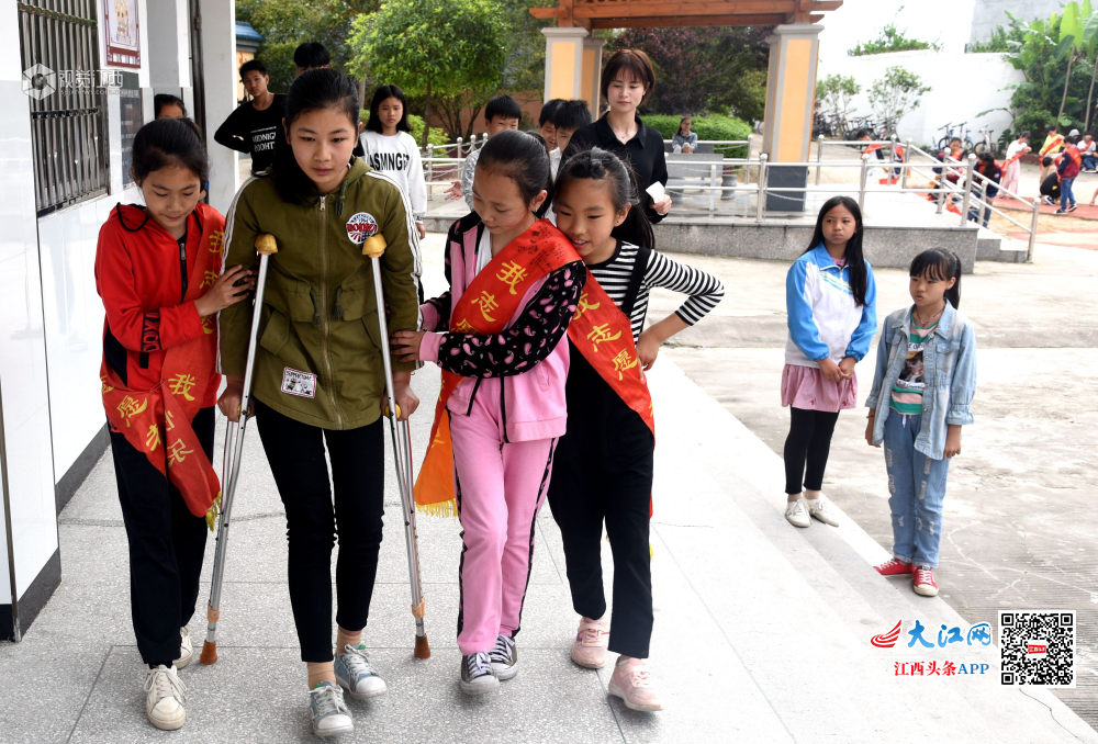 4月29日课间时间,南丰县市山镇中心小学五(4)班的三名志愿者在走廊上搀扶该班受伤学生饶凯茜,帮助她解决行走困难的问题。