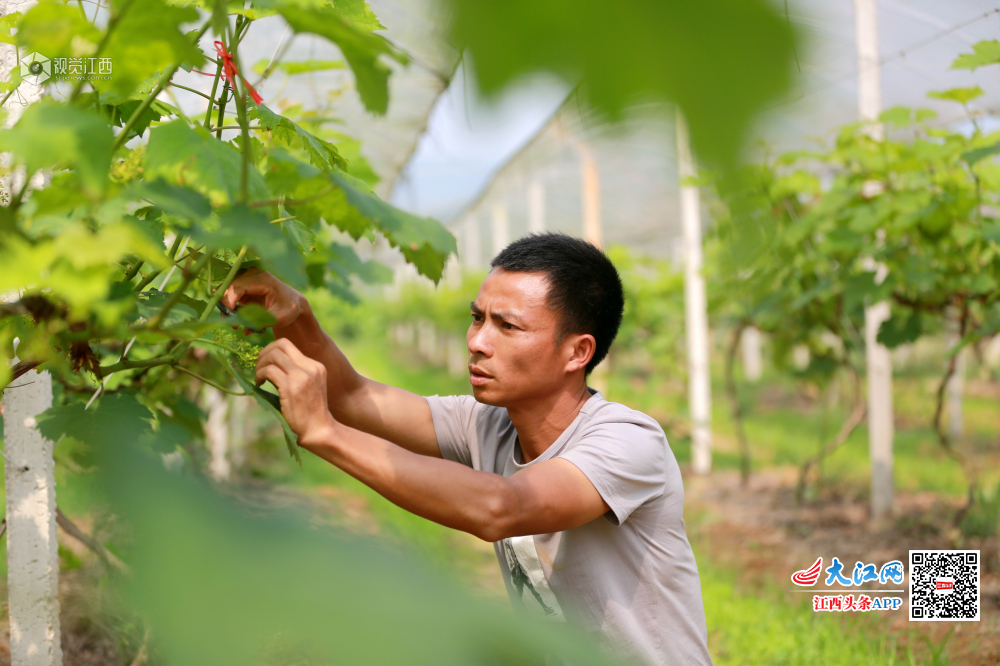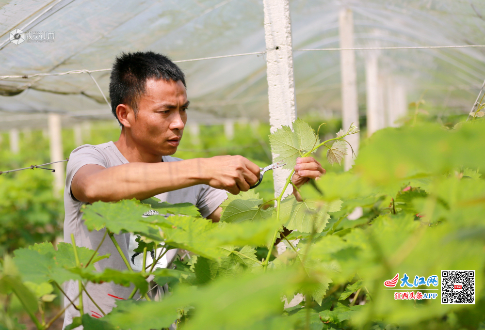 5月1日,江西省吉安市吉水县醪桥镇西坑村国富生态家庭农场,从北京返乡创业的刘国富正在葡萄园为葡萄疏果。