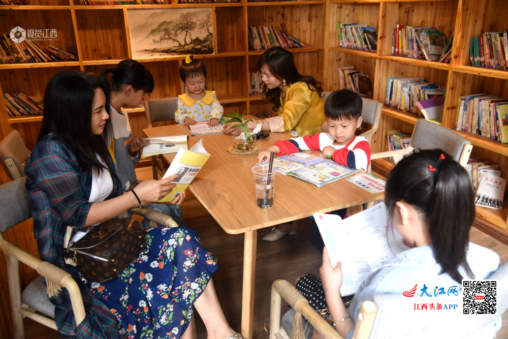 5月3日,在江西省南丰县洽湾镇洽湾村马口街“培澜书屋”里,小朋友与家长一起阅读自己喜欢的书籍。