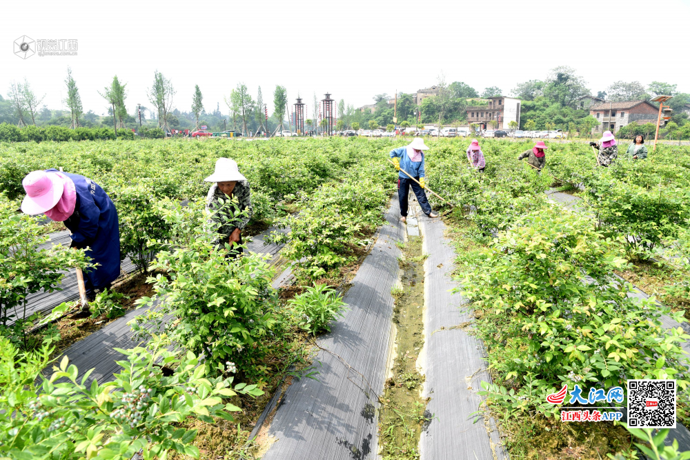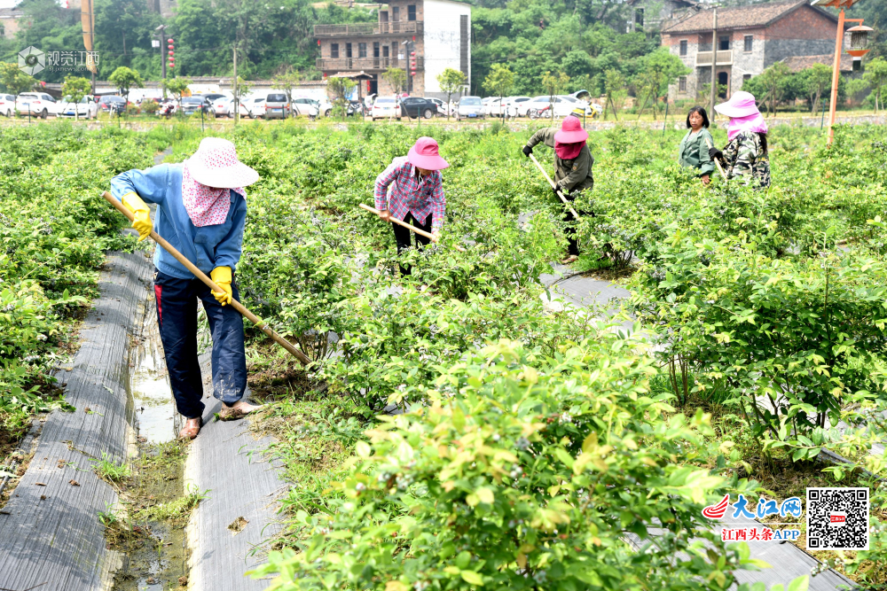 5月3日,江西省南丰县洽湾镇洽湾村的农民抓住有利农时,在该村特色种植基地——蓝莓田里锄草。
