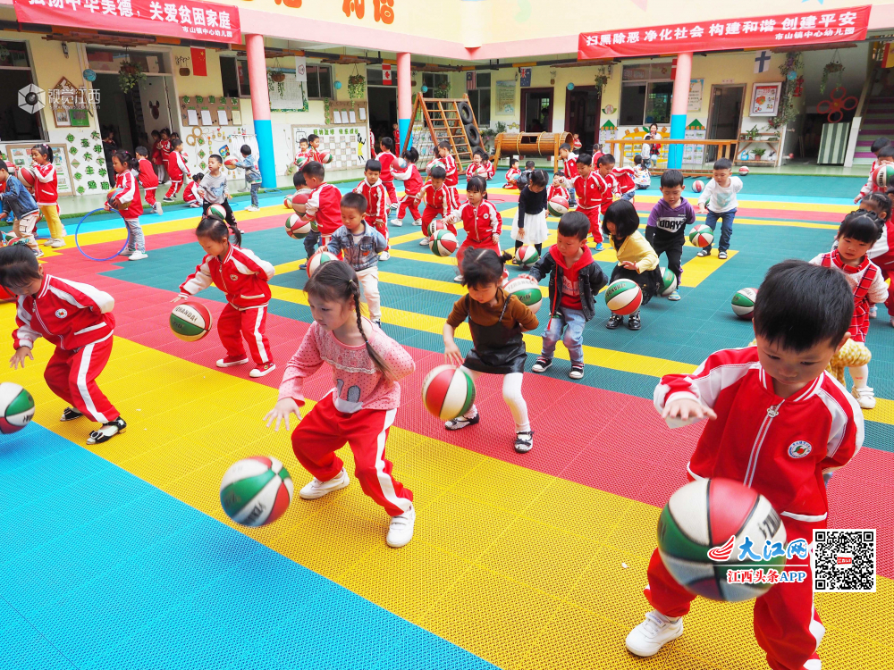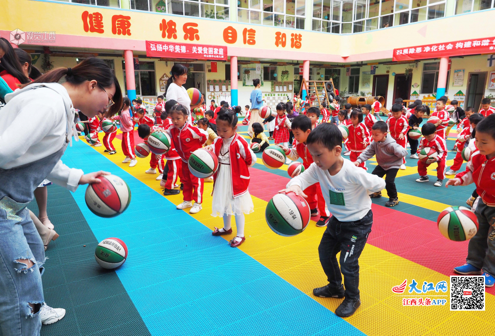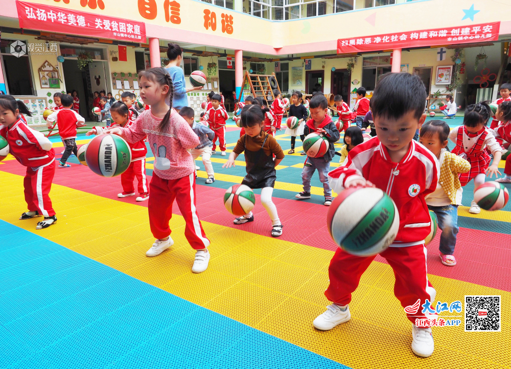 5月5日,江西省南丰县市山镇中心幼儿园操场上,小朋友在老师的指导下进行拍球训练。近年来,南丰县教体部门大力推进“球类运动进校园”活动,让孩子们从小接触球类运动,学习球类运动知识,尽情体验球类运动带来的乐趣,感受球类运动魅力。