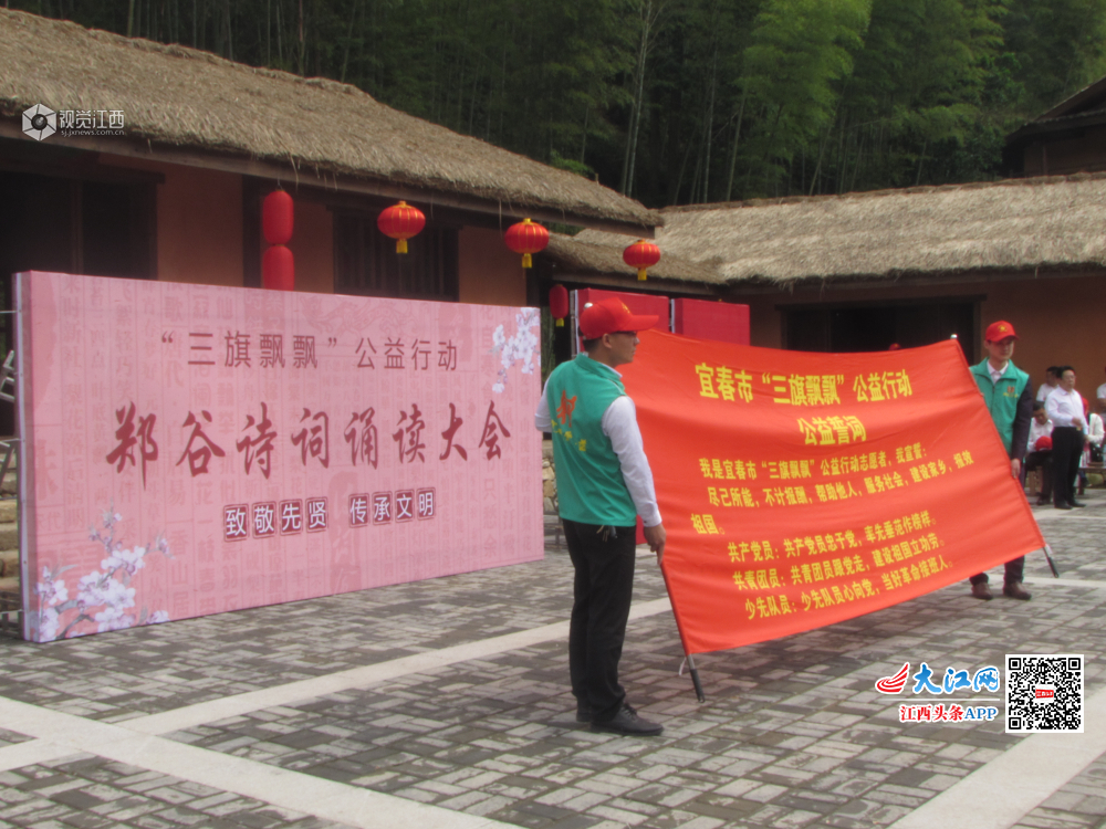 致敬先贤,传承文明,2019年5月10日,由宜春市关工委主办的“三旗飘飘——诵读郑谷诗词”文化公益行动在袁州区洪江镇郑谷草堂(仰山栖隐禅寺旁)隆重举行。来自宜春市委党校、宜春市第三中学、宜春市实验小学、宜春市机关幼儿园等单位,共计约230人参加了活动。
