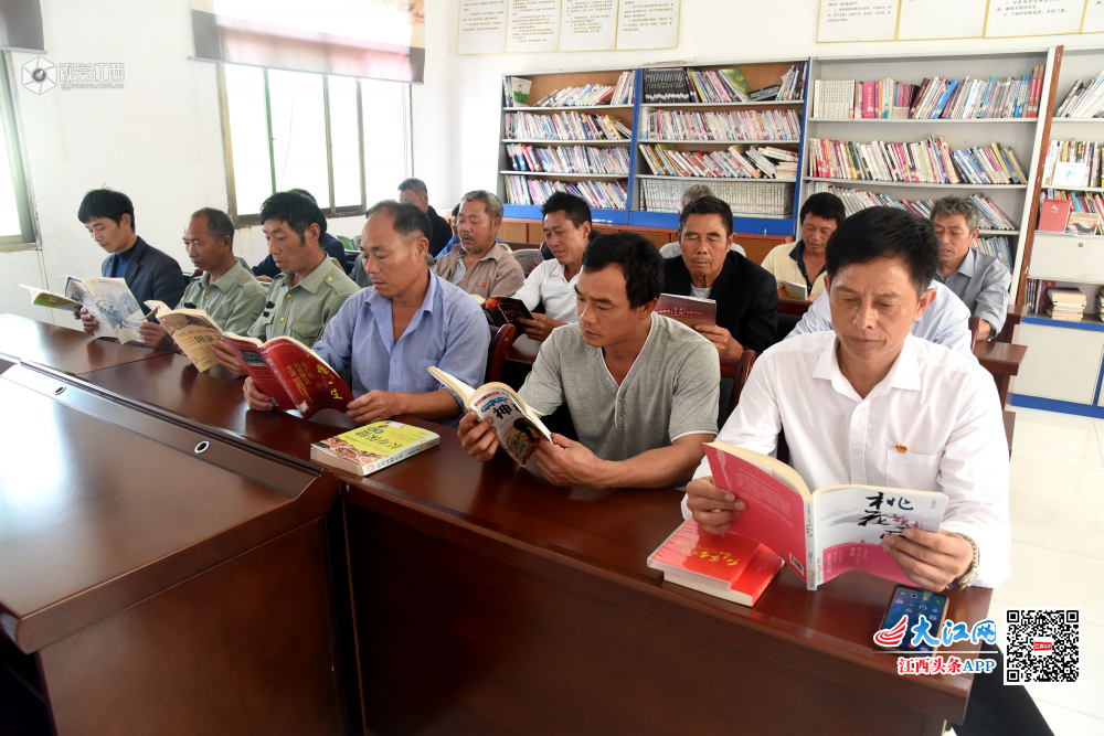 2019年5月10日,江西省南丰县白舍镇田东村农家书屋里,农民群众正在阅读自己喜欢的书籍,丰富农闲时的文化生活。
