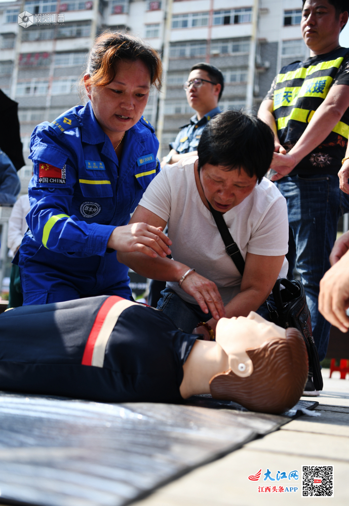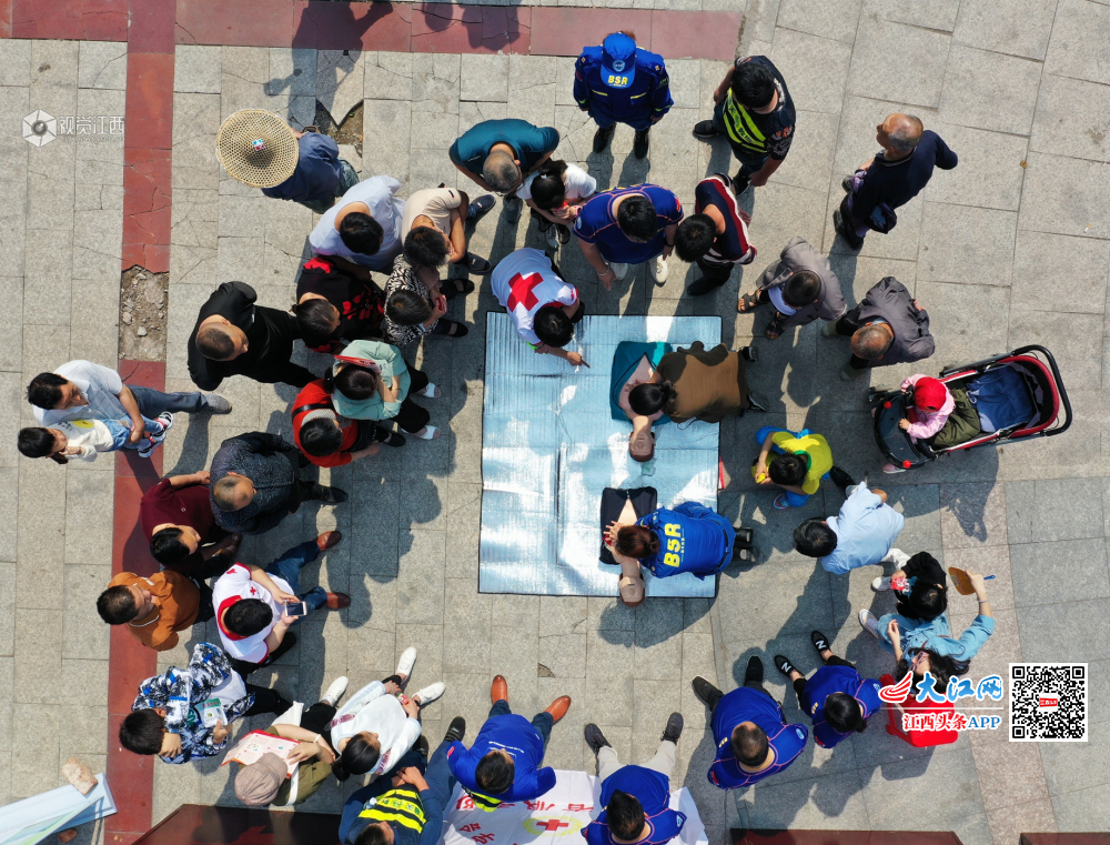 2019年5月12日,在江西省上饶市铅山县河口镇辛弃疾广场,市民在学习急救知识。当日,铅山县应急管理局、县民政局、红十字会等部门联合在辛弃疾广场开展防灾减灾知识展览,向过往市民讲解防灾急救知识,进一步增强市民的防控防灾意识,提高自救互救能力。