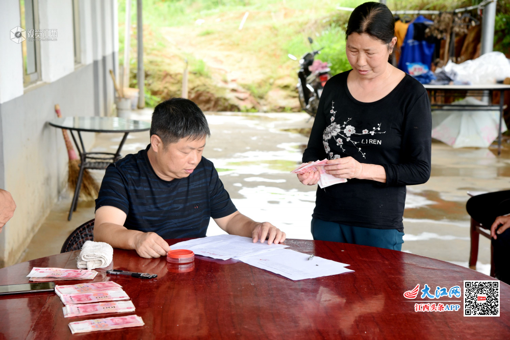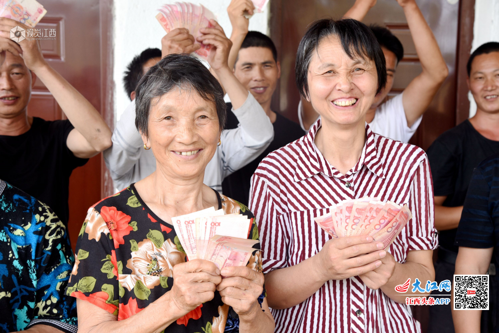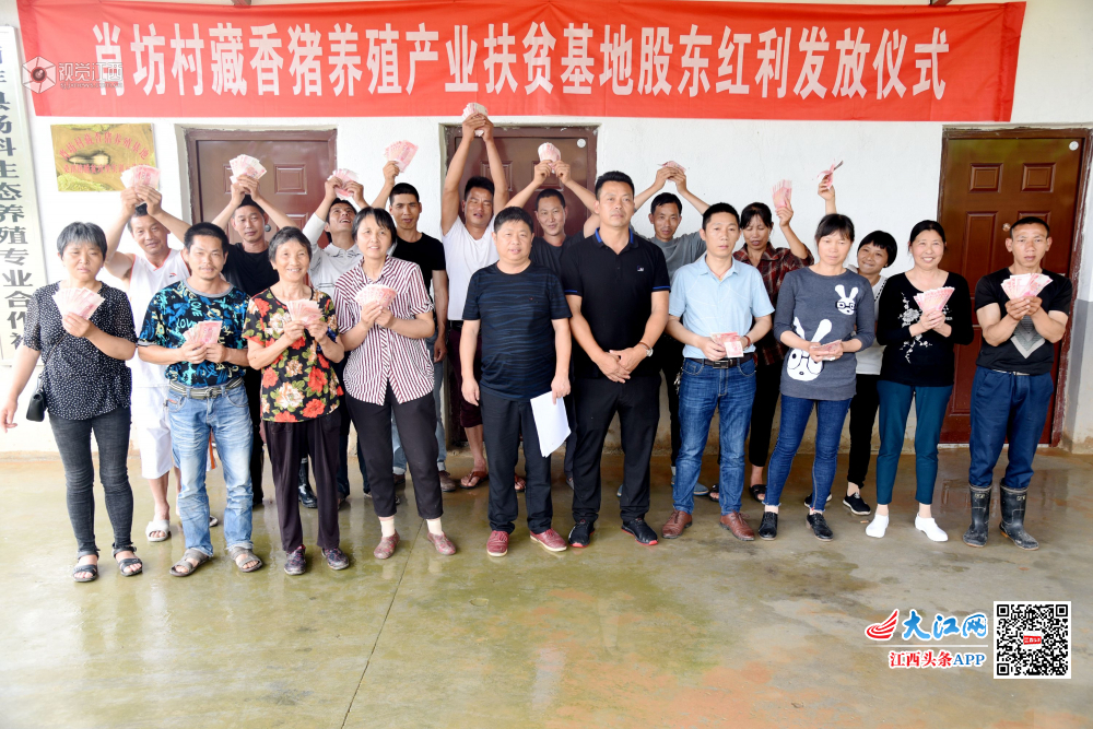 2019年5月17日,江西省南丰县桑田镇肖坊村藏香猪养殖扶贫基地,20户贫困户领取了2018年度分红款,每户平均收入1000元,贫困户心里喜洋洋。