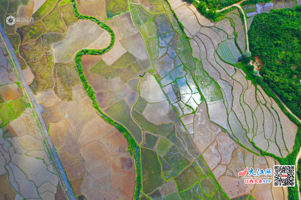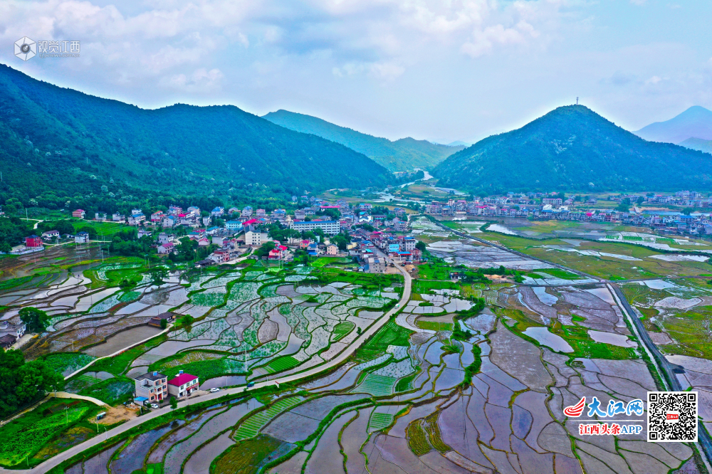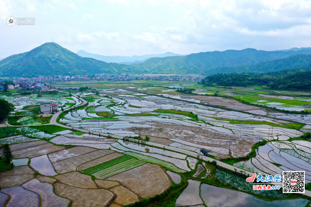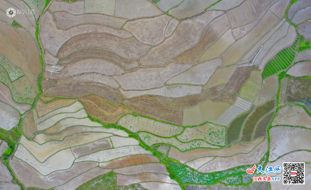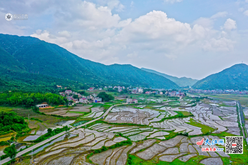 2019年5月18日,航拍江西省上饶市铅山县葛仙山镇港东村梯田,蓄满水的梯田犹如美丽画卷。初夏时节,铅山县葛仙山镇港东村梯田开耕,开耕后的梯田蓄水充盈,在阳光照耀下,蓝色的天空将如镜的梯田水面晕染得五彩缤纷,农民在田间辛勤劳作,层层叠叠的梯田蜿蜒迂回,构成一幅幅如诗似梦的美丽画卷。
