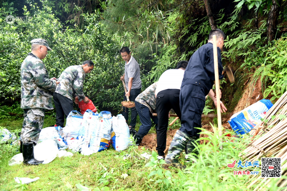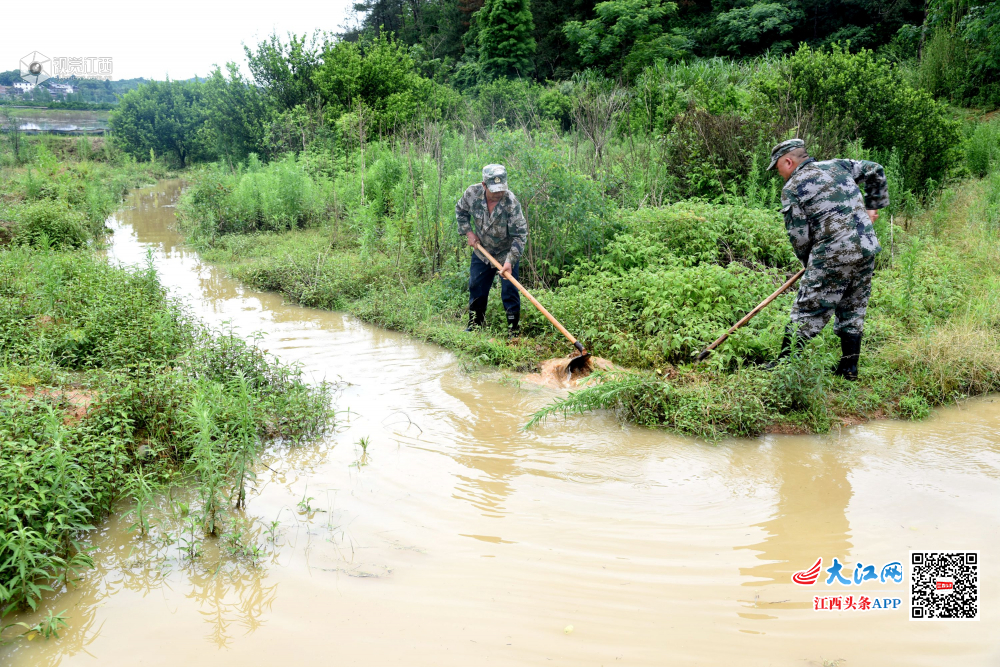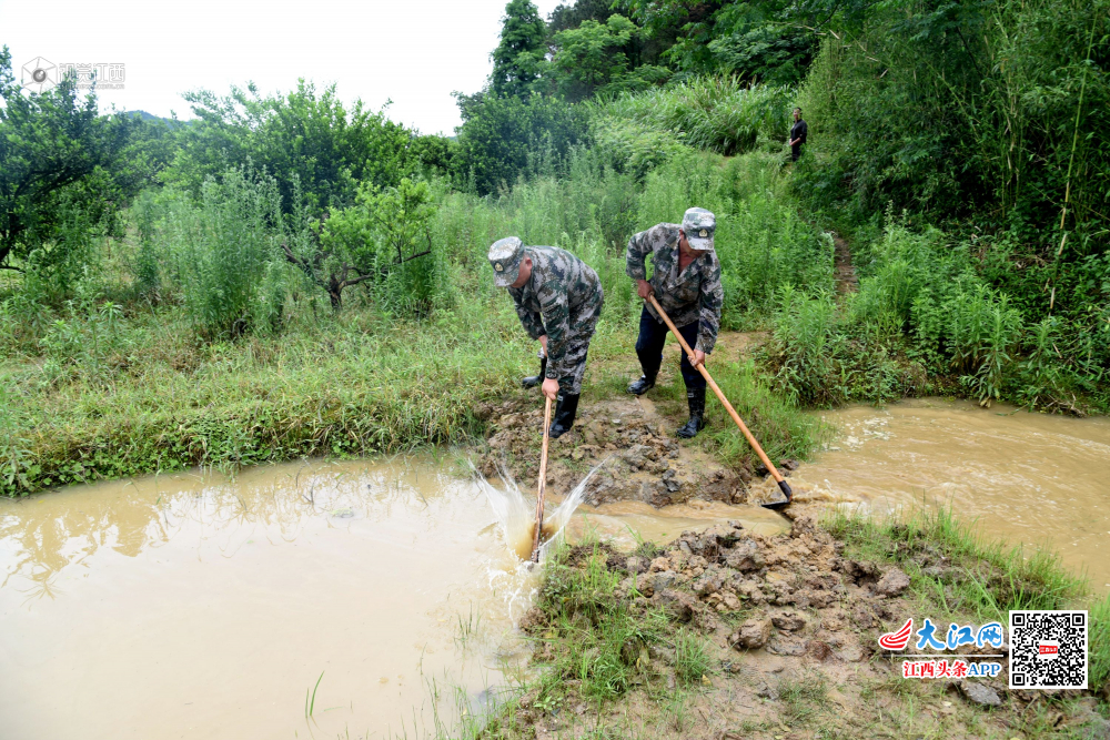 2019年5月17日,江西省南丰县桑田镇古城村门坊村小组桔园边,古城村民兵应急小分队的民兵在对塌方沿河堤坝进行抢修,对浸泡在水中的桔园进行清淤排水,确保损失降低到最低限度。