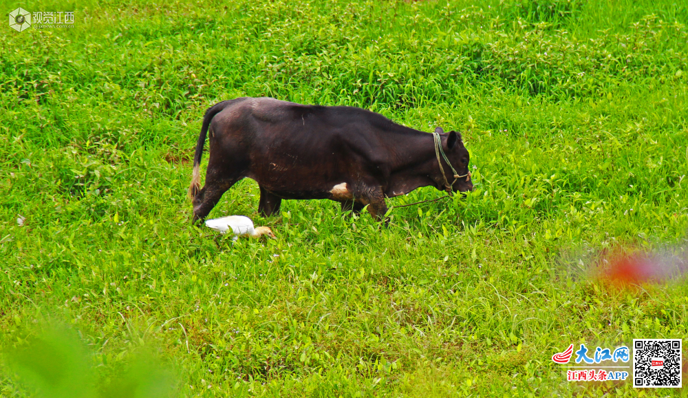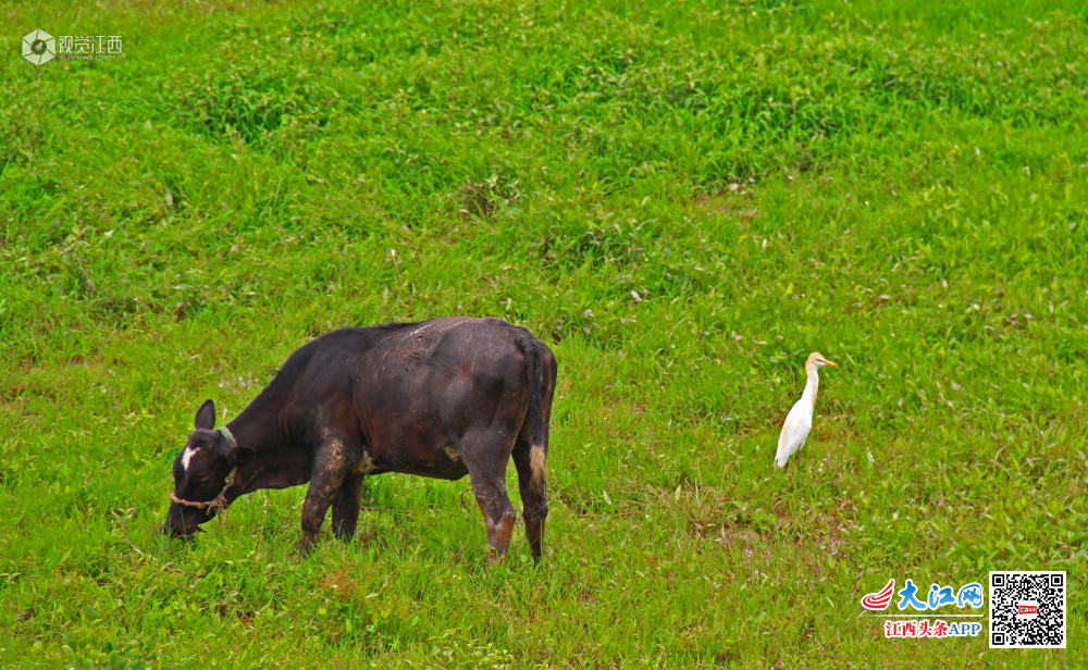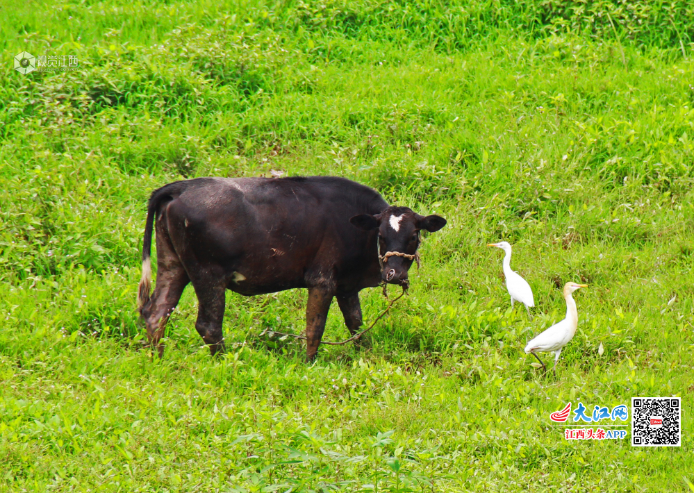 白鹭与耕牛和谐共生,呈现一幅生态美景。